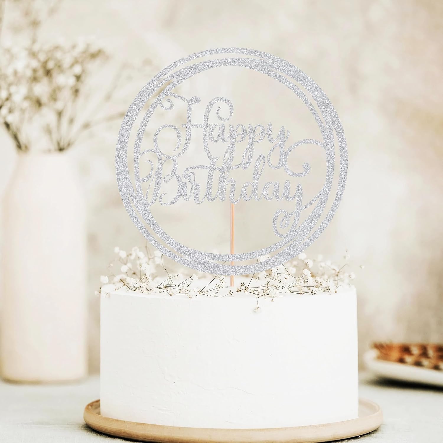 Happy Birthday Cake Topper - Silver Glitter Happy Birthday Cake Decoration Supplies for Children or Adults - Happy Birthday Cake Bunting Decor, Photo Booth Props