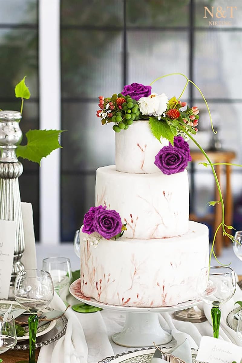 N&T NIETING Artificial Flowers Glowing Purple Flowers Foam 50pcs Glitter Roses Real Looking Fake Roses with Stem for DIY Wedding Bouquets Centerpieces Bridal Shower Party Home Decorations