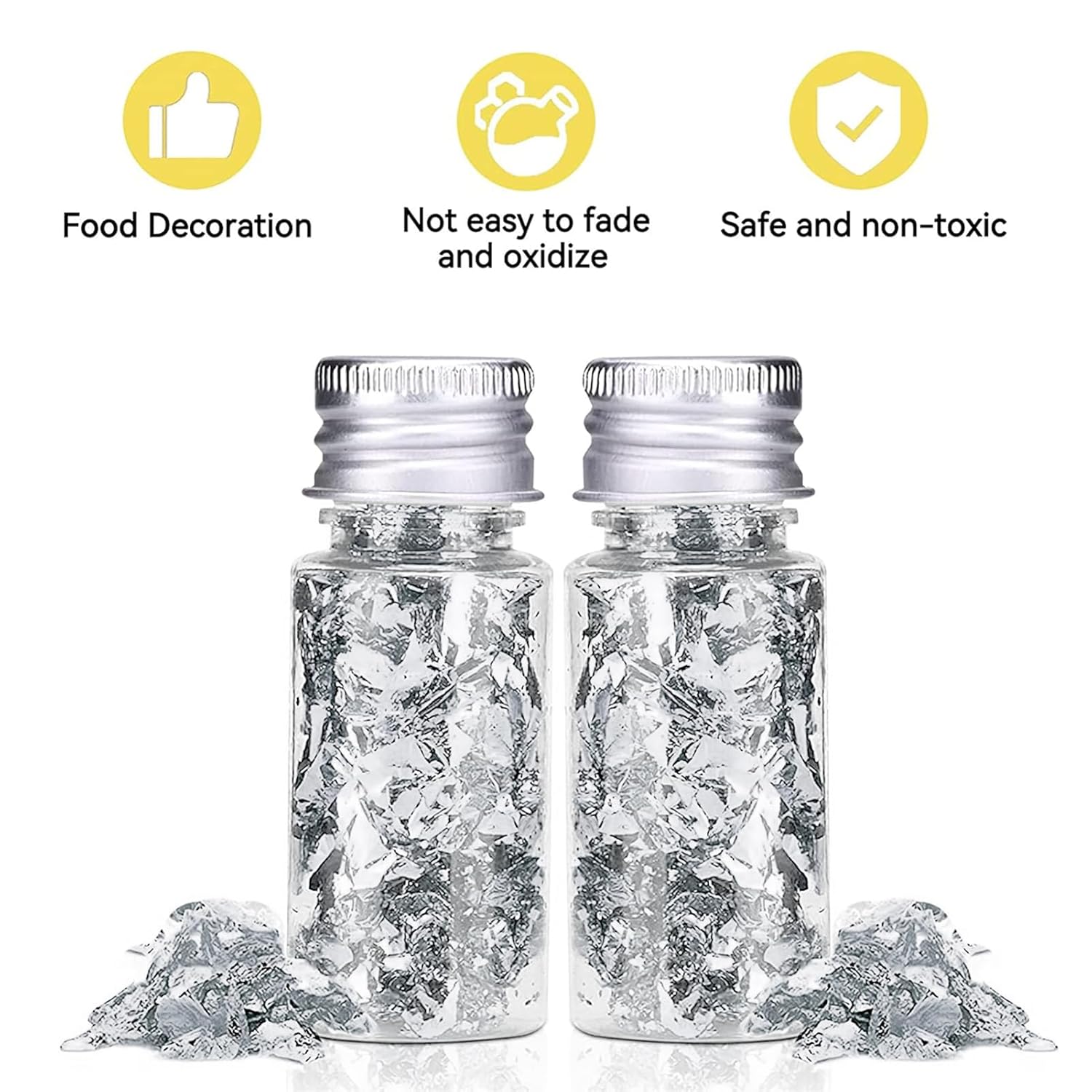 - 【Perfect Decoration For Food】Edible gold flakes is a perfect decorative items, can be added to coffee, tea, hot pot, seasonings, cosmetics, bath agents, etc. SIlver leaf fakes beautiful and stylish, gold flakes for crafts can be widely used in families, bars, restaurants, etc.