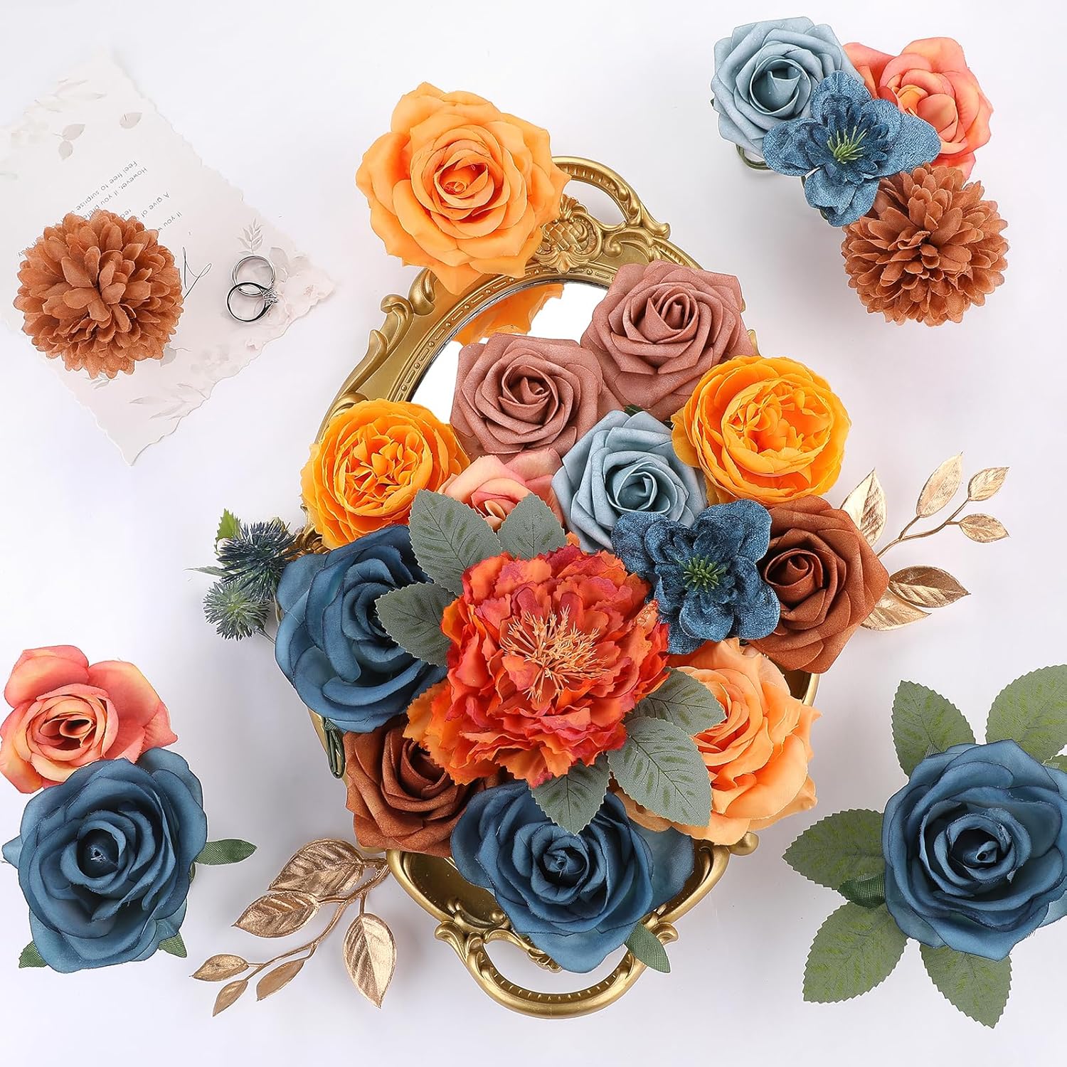AmyHomie Teal Orange Artificial Flowers Combo Silk Mix Peony Rose Fake Flowers w/Stem for DIY Wedding Bouquets Centerpieces Arrangements Table Fall Decor Party Bridal Baby Shower Home Decorations