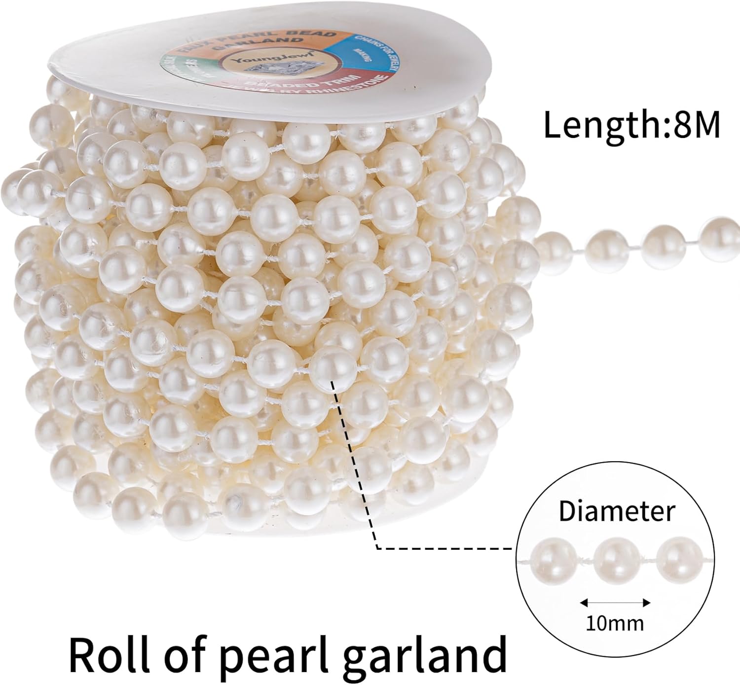 10mm Pearl Strands,9 Yds of Lvory Fake Beads Garland Spool Roll with Stringed Pearls for Crafting,Wedding Party,Christmas Tree Decoration.