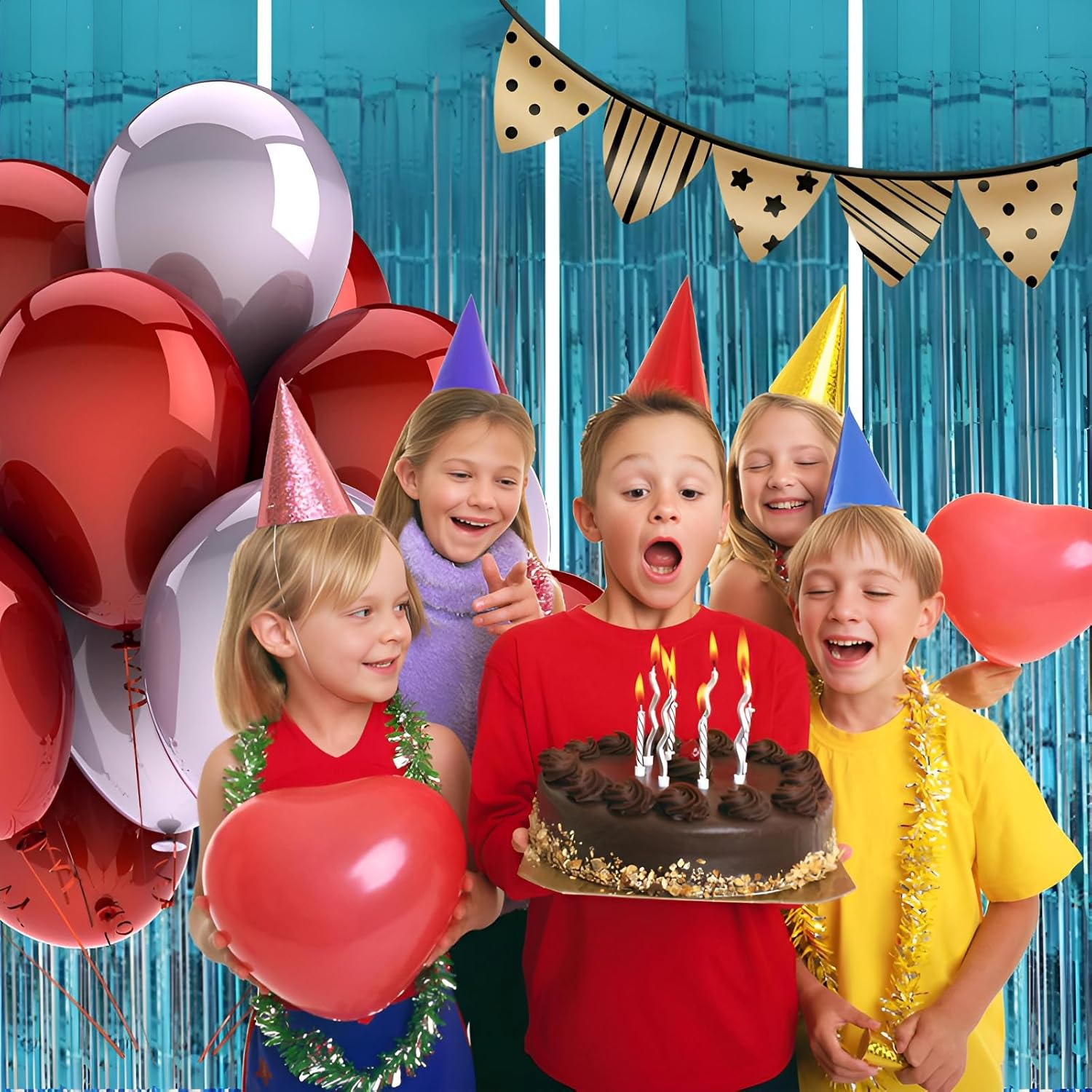 - Pair with other party decorations: Tinsel backdrop curtain can be paired with LED lights, balloons, banners, wreath, garlands, swirl streamer, tissue paper pom poms.