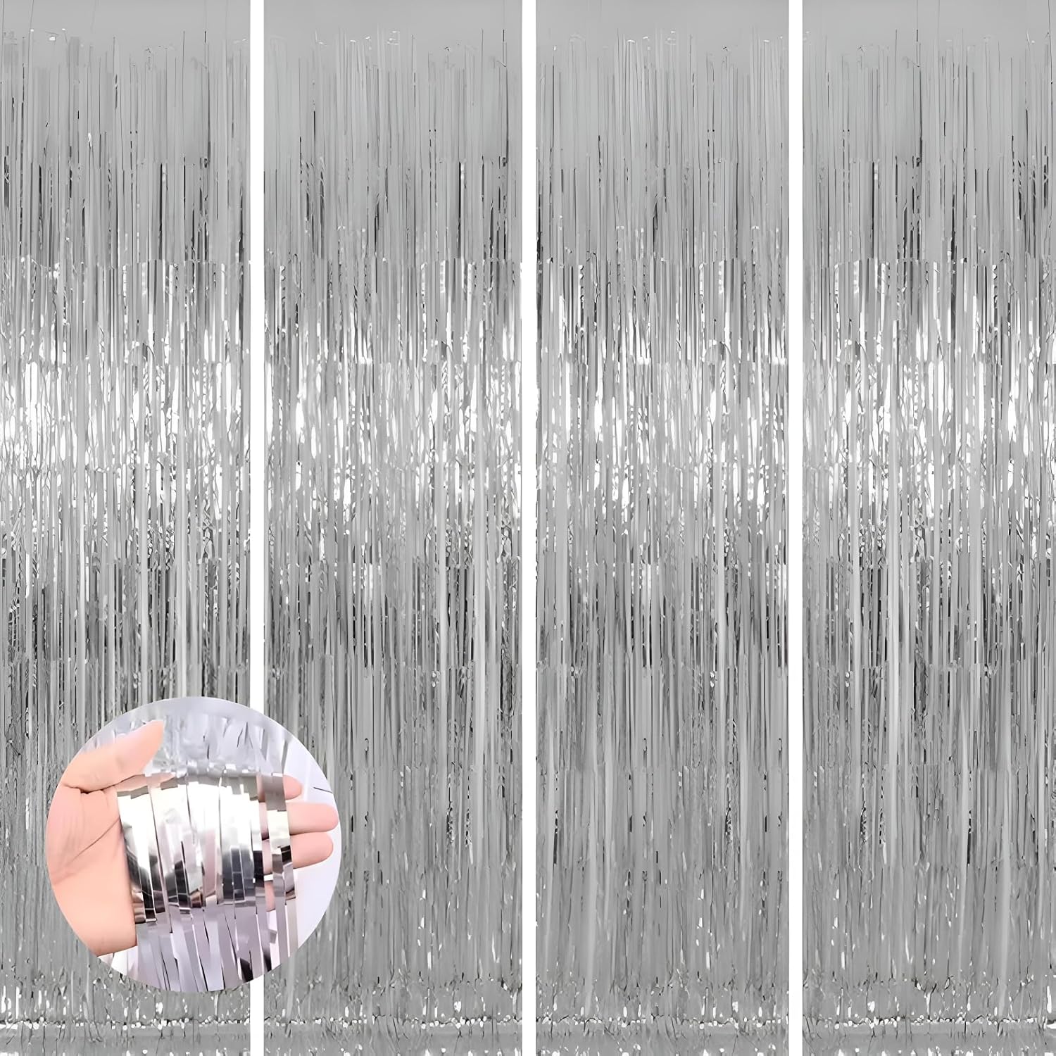- 4 Pack foil fringe tinsel backdrops: each measuring a whopping 3.3 ft x 8.3 ft.Long enough for indoor or outdoor parties. Also can be cut in suitable length for your birthdays Party decorations These backdrops are perfect for creating stunning party decorations, event backdrops, and photo booths that will leave your guests in awe.