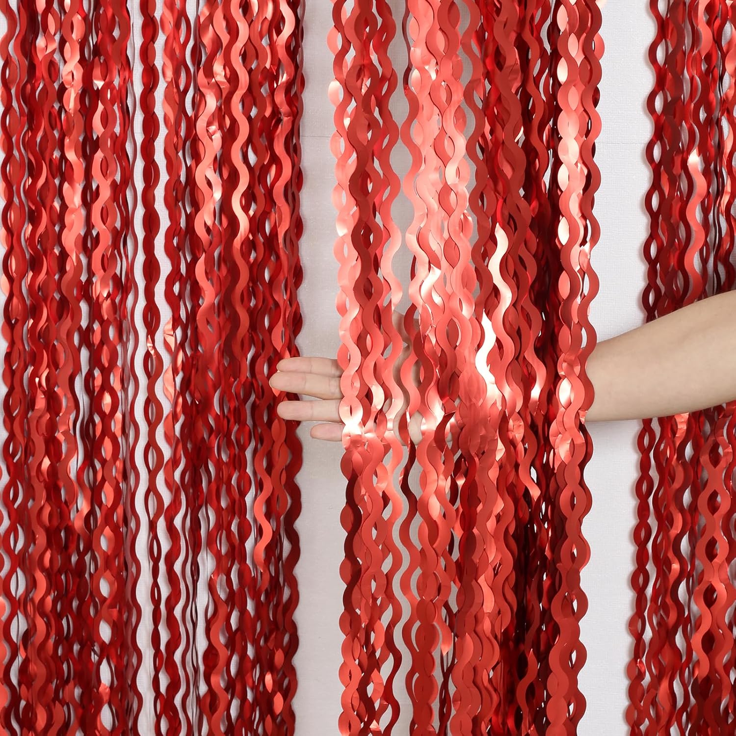 - Package Contents: 4 pack wavy red foil fringe curtains,each curtain is 3.3ft x6.6ft,You can cut the metallic backdrop into the suitable length for use,Wonderful accessories for decorating doors and walls