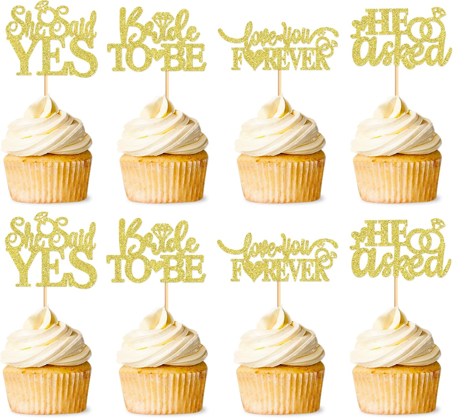 24 Pcs He Asked She Said Yes Cupcake Toppers Cake Picks for Wedding Engagement Party Cake Picks for Wedding Bridal Shower Party Cake Decorations golden