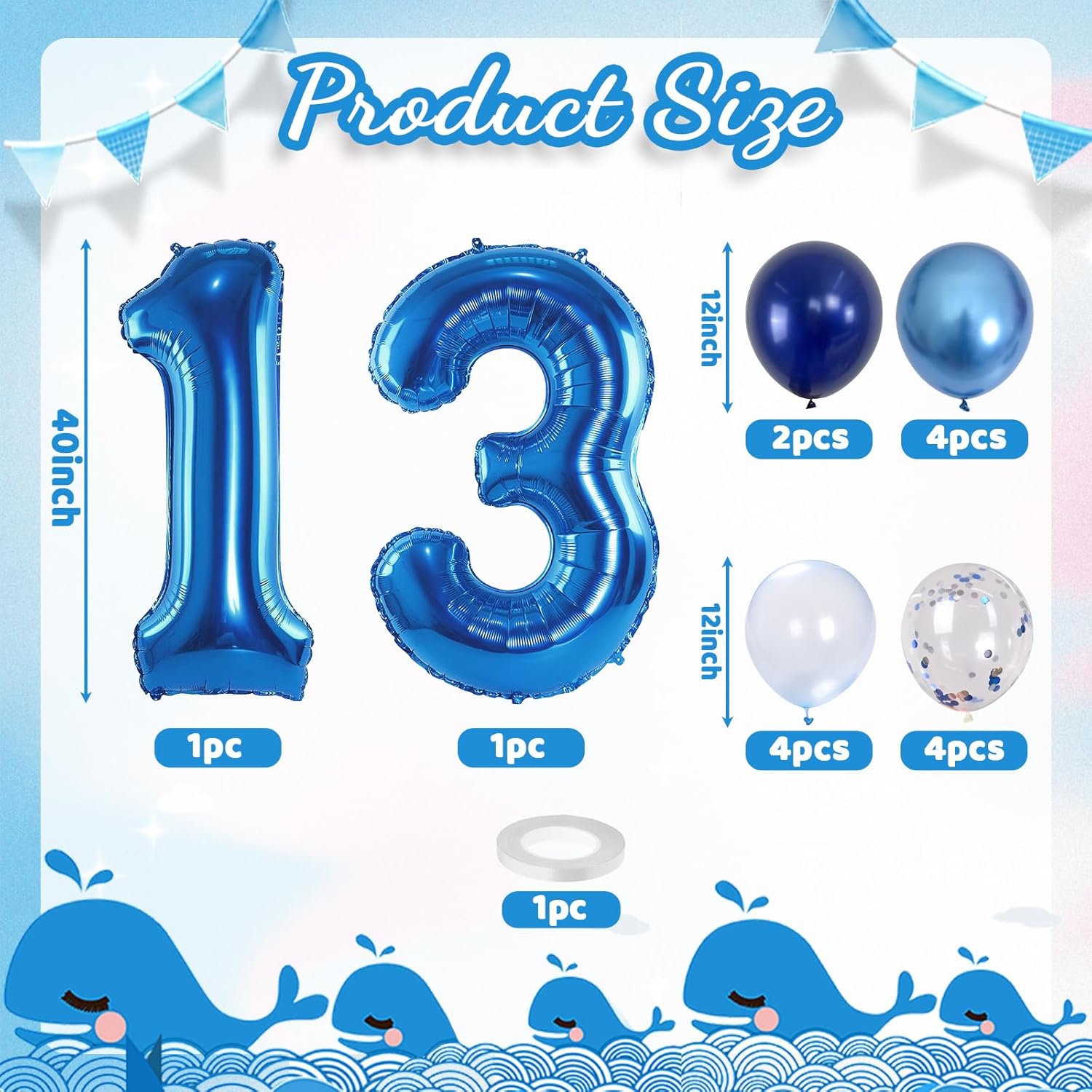 - π Dark Blue Number 13 Balloon: Our package included 40 inch foil number 13 balloon(2pcs), 12 inch metallic blue balloon(4pcs), blue silver confetti balloon(4pcs), pastel blue balloon(4pcs), Light Navy Blue Balloon(2pcs), 1pcs straw and 1 roll ribbon. Simply inflate the balloon using the straw, and you're ready to party! Navy blue number foil balloons are the best for girls or boys birthday party decoration.