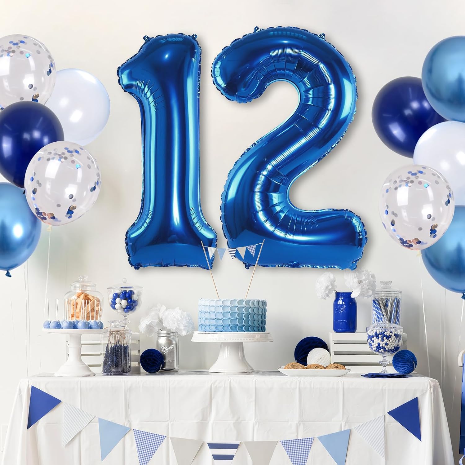 - π Dark Blue Number 12 Balloon: Our package included 40 inch foil number 12 balloon(2pcs), 12 inch metallic blue balloon(4pcs), blue silver confetti balloon(4pcs), pastel blue balloon(4pcs), Light Navy Blue Balloon(2pcs), 1pcs straw and 1 roll ribbon. Simply inflate the balloon using the straw, and you're ready to party! Navy blue number foil balloons are the best for girls or boys birthday party decoration.