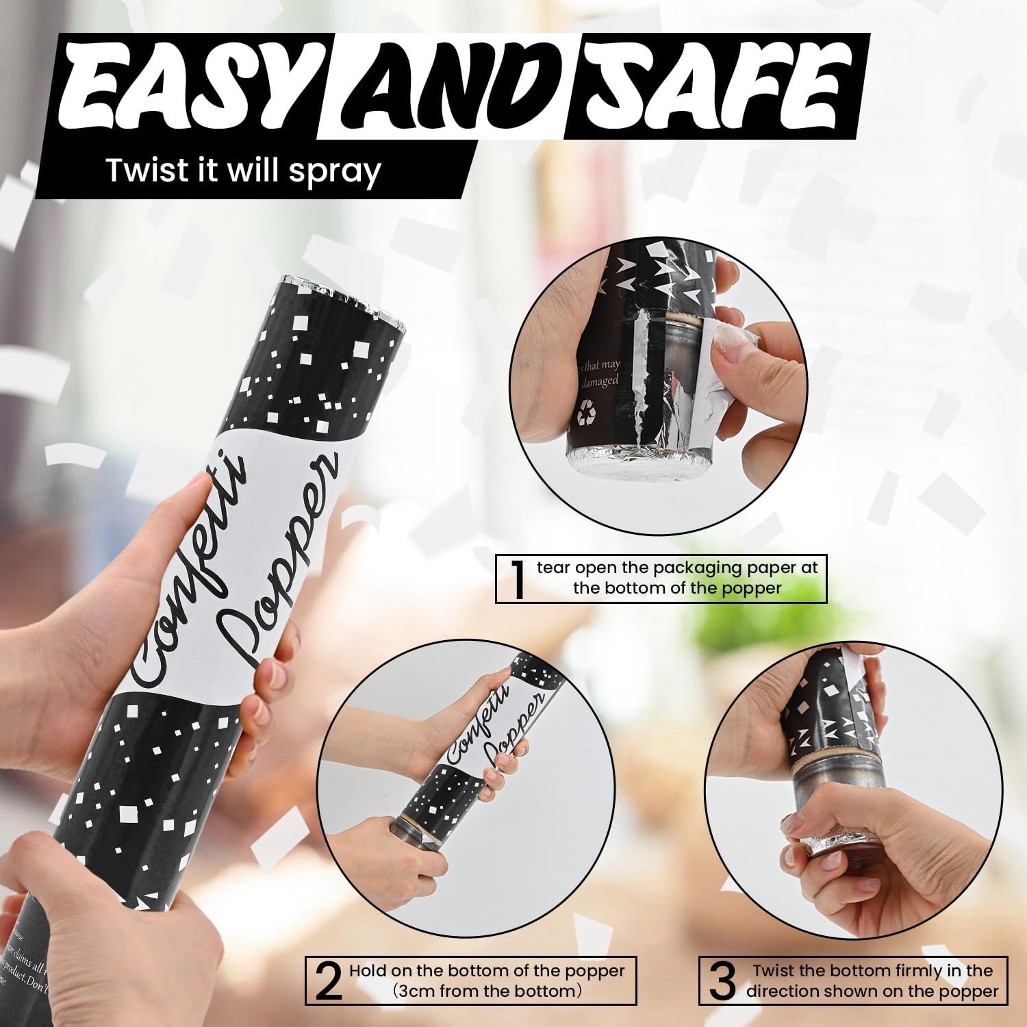 - 【Safe and Fun White Confetti Poppers】 Enjoy popping our White confetti poppers, made with safe, non-toxic materials. Our high-quality confetti cannons are safe for indoor and outdoor use, ensuring a wonderful and worry-free party experience for you and your guests.