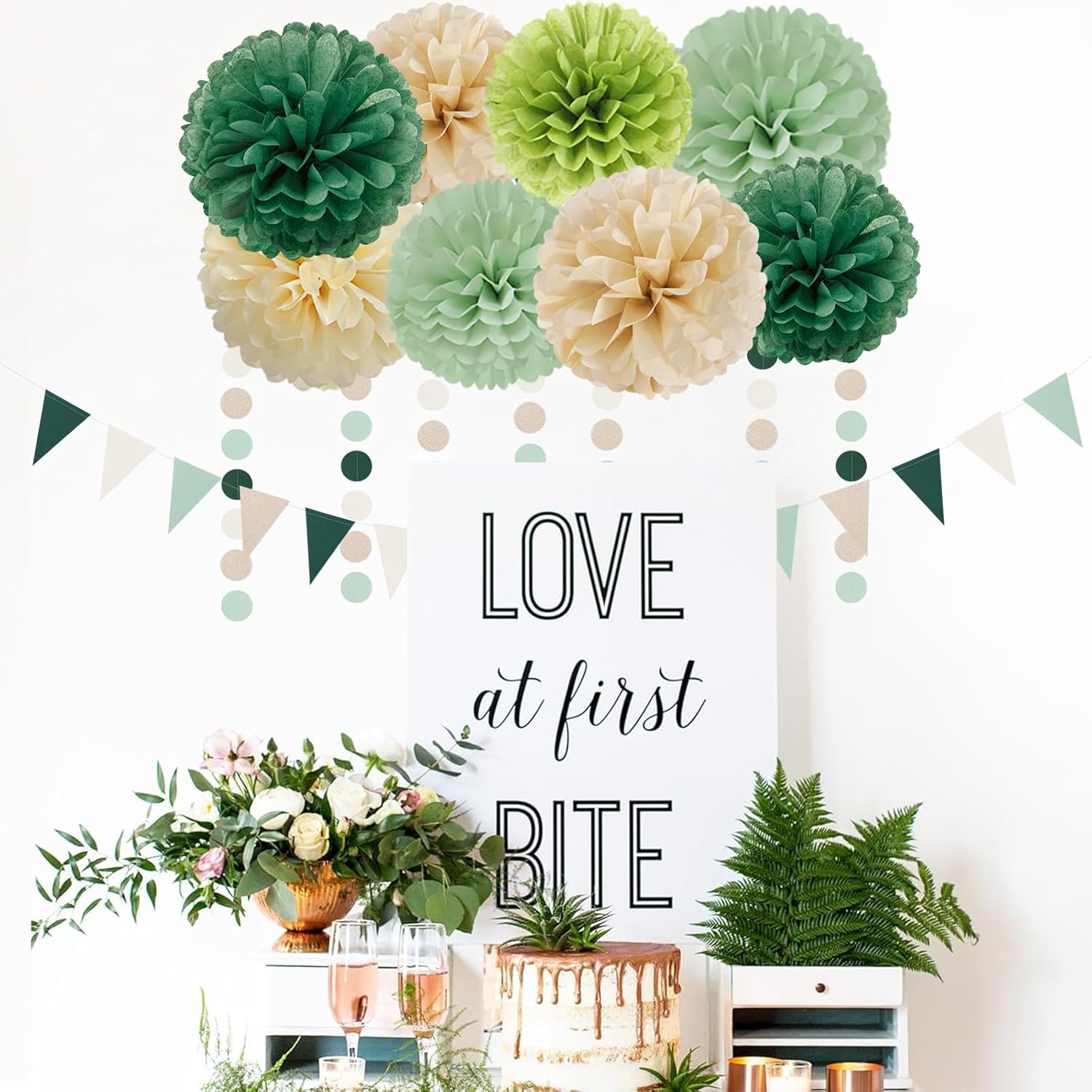 - 【Sage-Olive Green Champagne-Gold Party Kits】The party decorations kits include 8pcs tissue paper flowers: 4pcs 8" and 4pcs 10" in sage green,olive green,champagne color, 1pcs Triangle Flags,1pcs circle dots paper garland,20pcs tassel garland. Total30pcs.