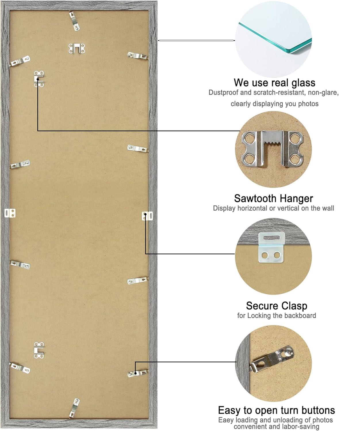 12x36 Picture Frame 2 Packs, Real Glass and Grey Wood Frame, Display Collage Pictures Twelve 4x6 With Mat or Pennant 12 x 36 Without Mat - Horizontal or Vertical Wall Mounting