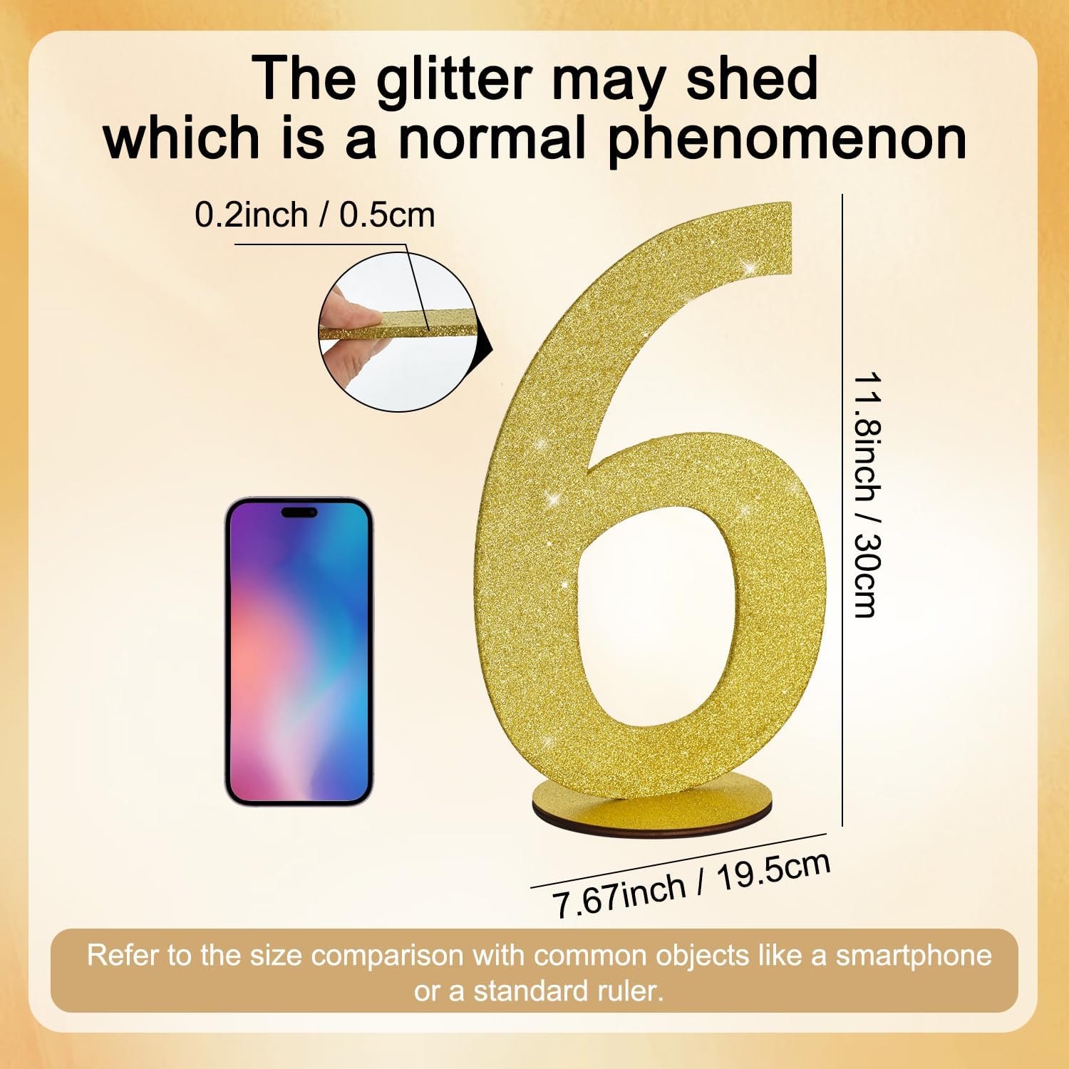 - Item Information: 1*6 gold glitter number ornament. Size: 30*20*0.3 CM (11.8 * 7.9 * 0.12 Inch)