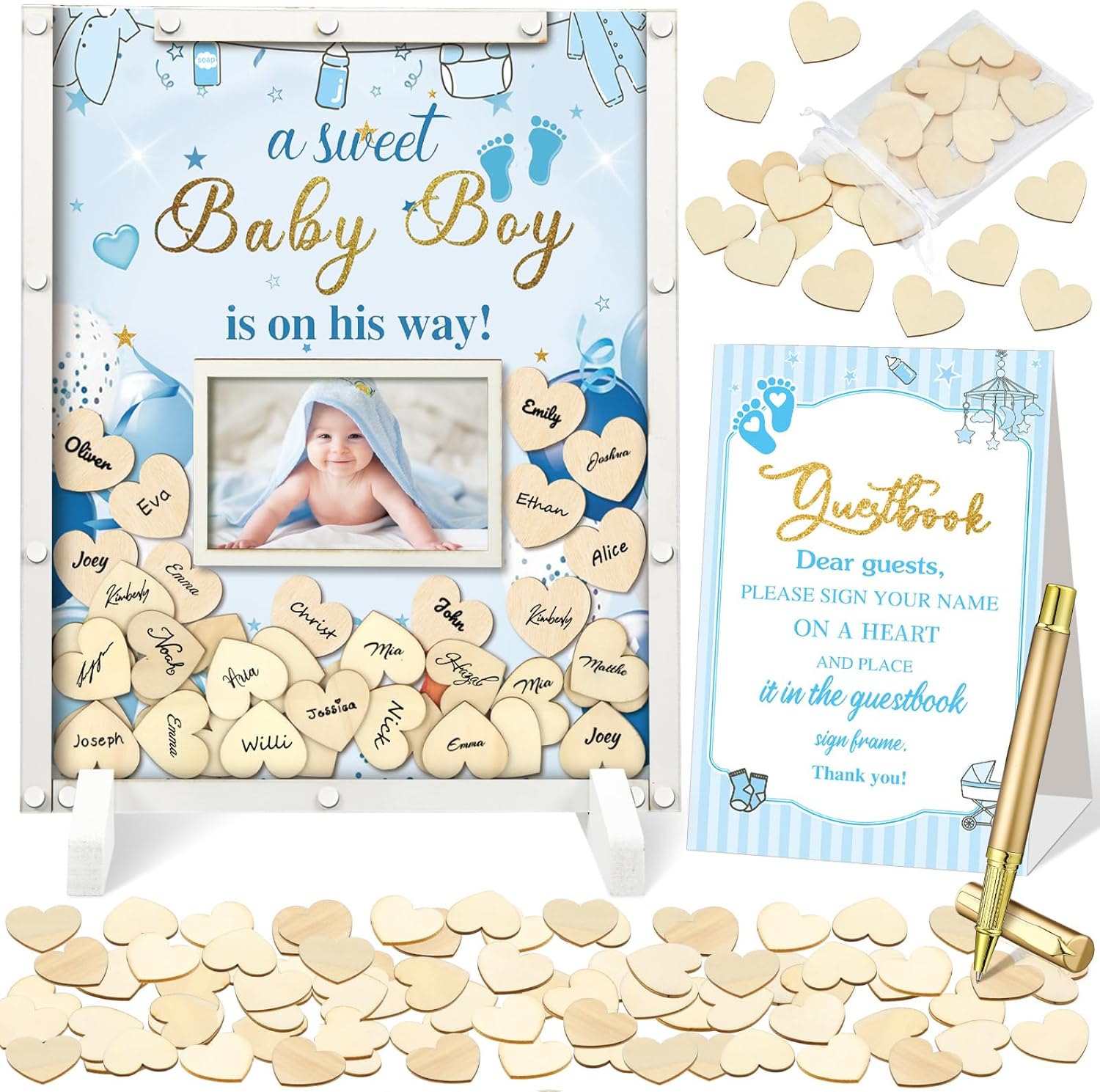 65 Pcs Blue Baby Shower Guest Book Alternatives He or She Gender Reveal Baby Shower Decorations Sign in Guest Book with Picture Frame and 60 Wooden Chip