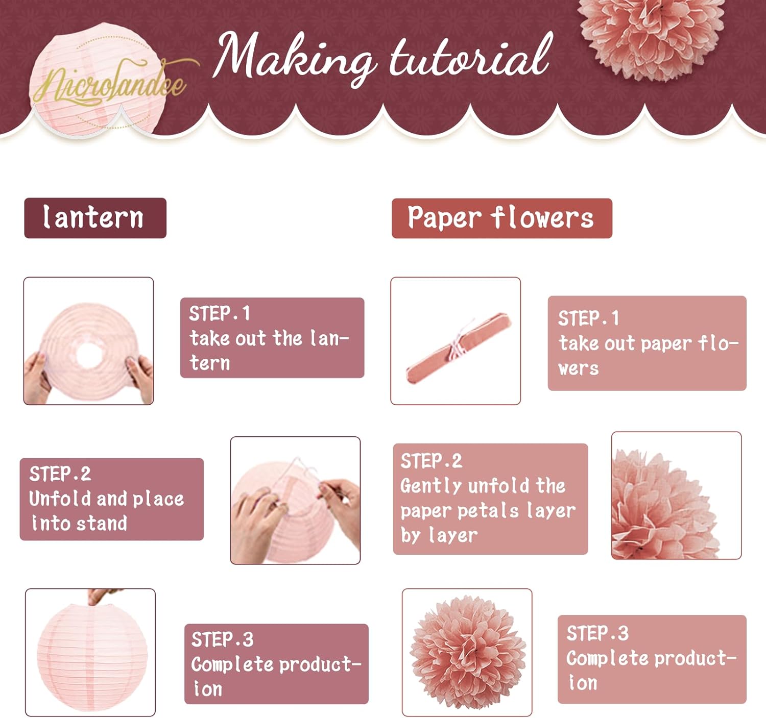 - Perfect for Any Celebration – This tissue pom poms and paper lanterns combo adds elegance to wedding party decorations, birthday party setups, retirement party backdrops, baby showers, and more. The rich burgundy, blush pink, and rose gold hues create a warm, festive atmosphere