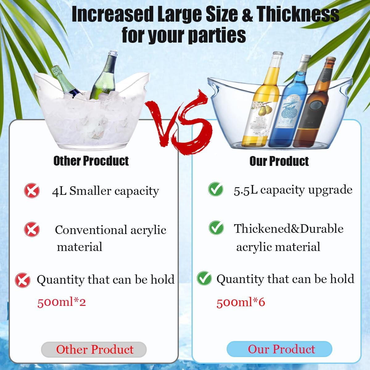 - Premium Quality & Enhanced Durability: Crafted from premium quality,thickened acrylic material, our beer bucket is built to last.The built-in handle provides easy portability, while the sturdy construction prevents leaks of water or ice.Helping to maintain the cool temperature of ice and beverages for longer periods. This feature ensures that your drinks stay chilled and refreshing, enhancing the overall drinking experience for your guests.