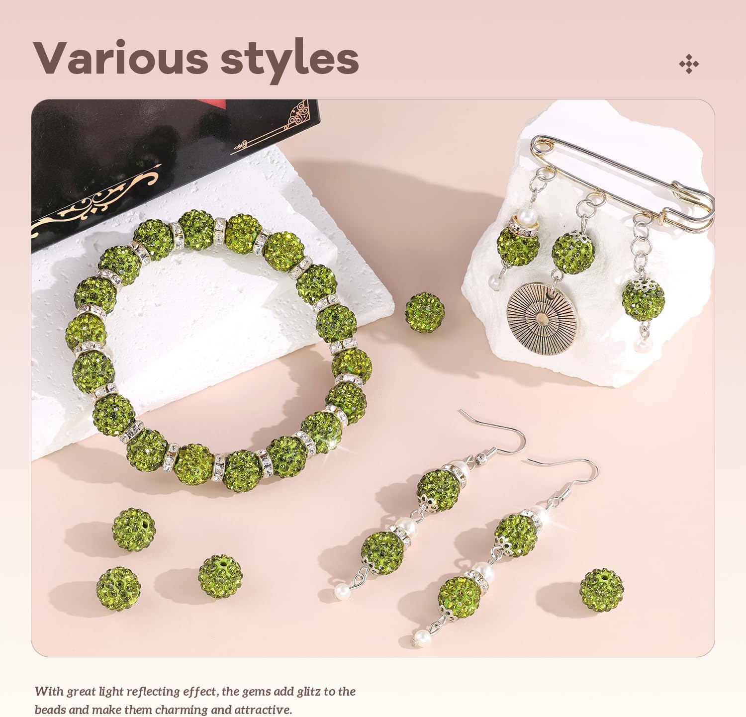 200pcs 10mm Rhinestone Beads for Jewelry Making, Olivine Shiny Round Disco Ball Beads Bulk, Sparkle Crystal Clay Christmas for Bracelet Baseball Necklace Earring Crafting and DIY