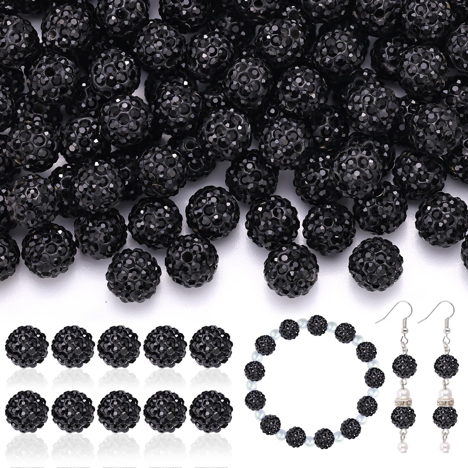 200pcs 10mm Rhinestone Beads for Jewelry Making, Black Shiny Round Disco Ball Beads Bulk, Sparkle Crystal Clay Christmas for Bracelet Baseball Necklace Earring Crafting and DIY