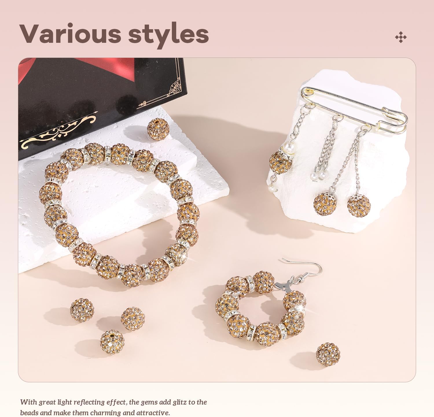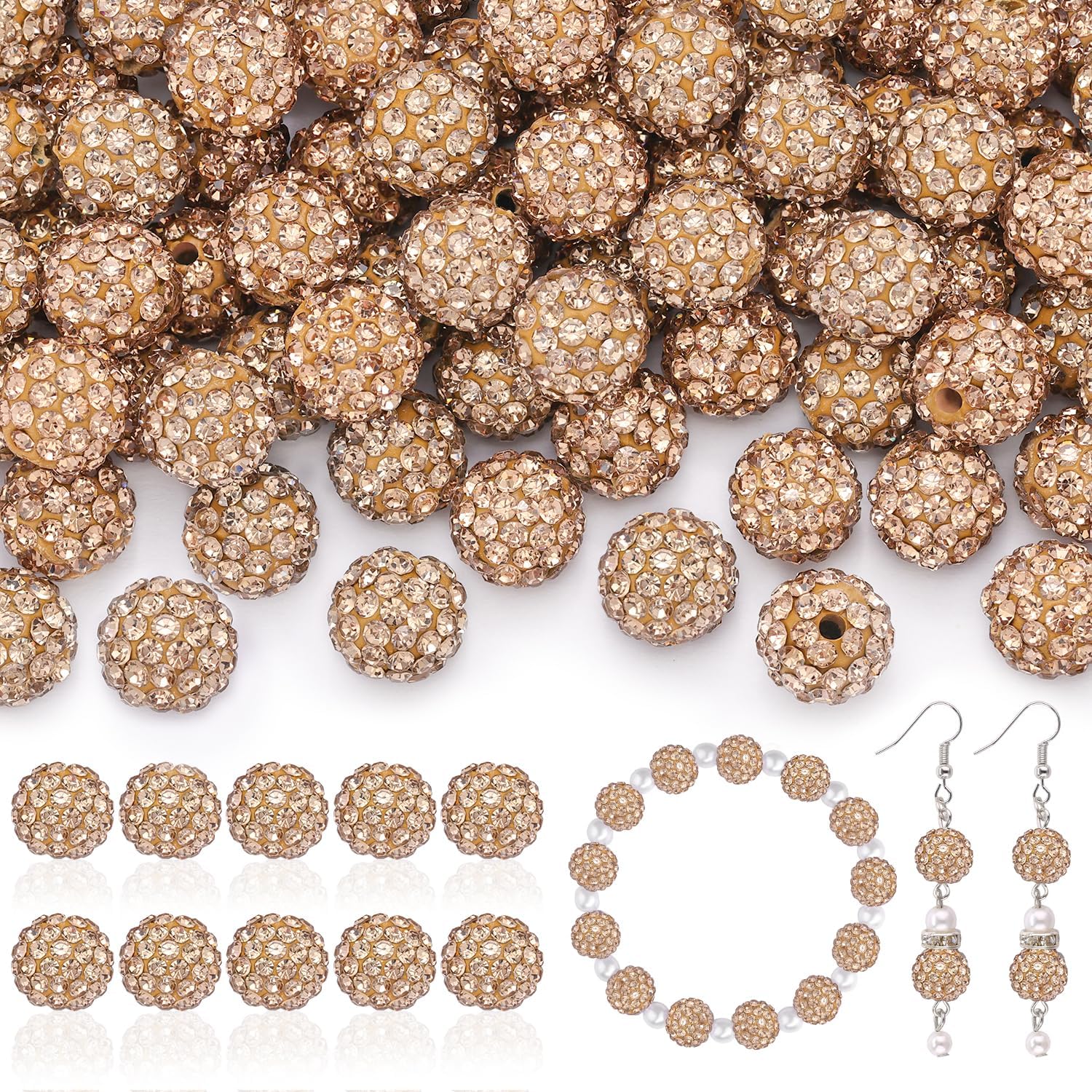 200pcs 10mm Rhinestone Beads for Jewelry Making, Light Brown Shiny Round Disco Ball Beads Bulk, Sparkle Crystal Clay Christmas for Bracelet Baseball Necklace Earring Crafting and DIY