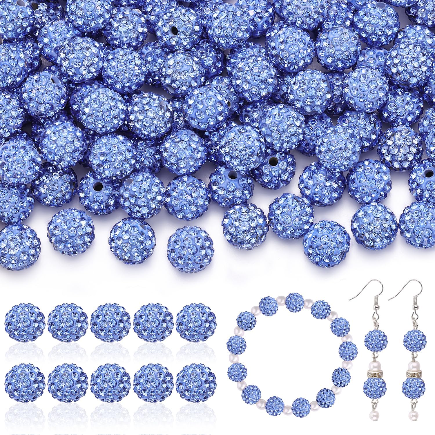 200pcs 10mm Rhinestone Beads for Jewelry Making, Light Blue Shiny Round Disco Ball Beads Bulk, Sparkle Crystal Clay Christmas for Bracelet Baseball Necklace Earring Crafting and DIY