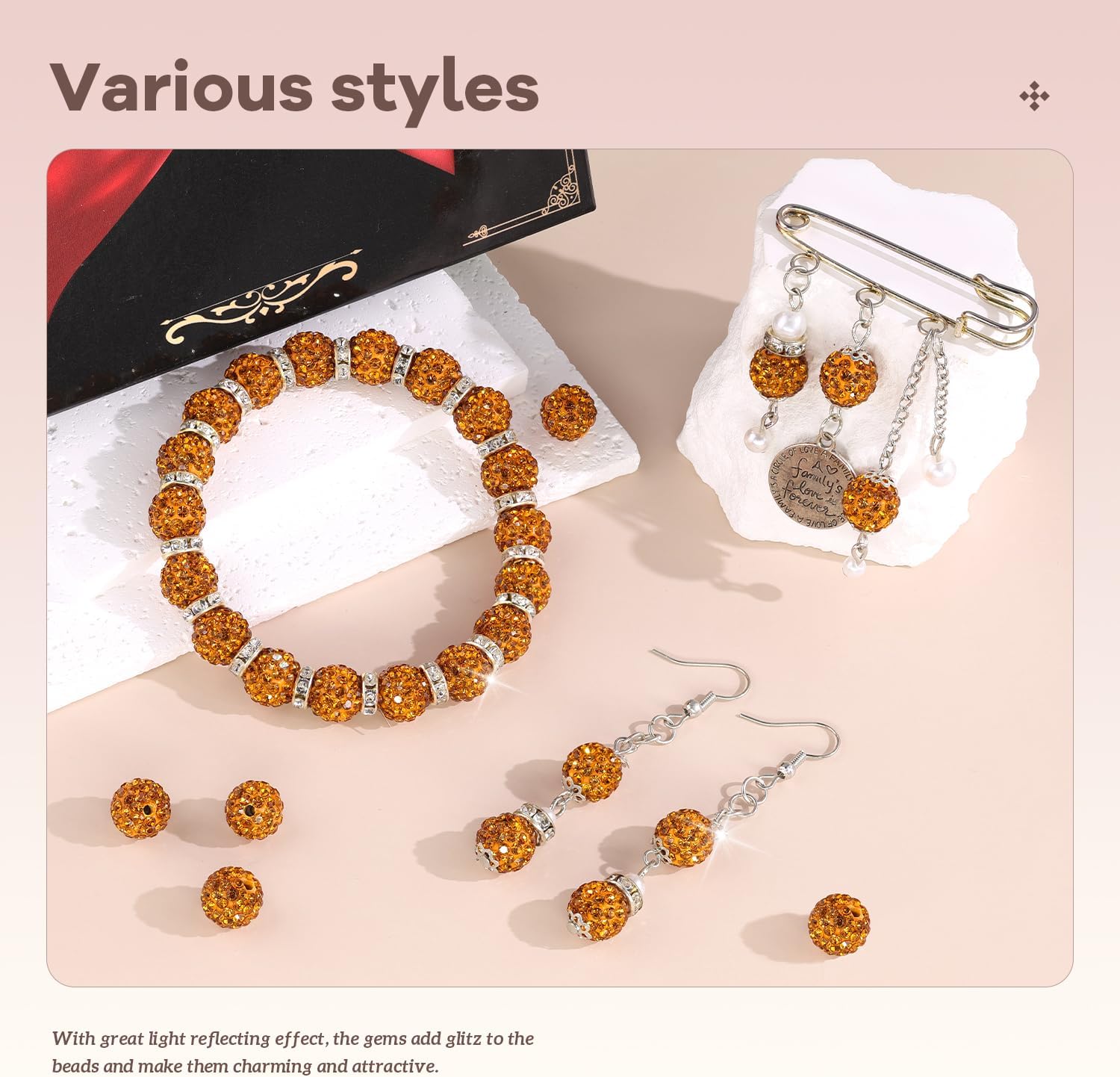 - BLING EFFECT --With great light reflecting effect, the gems add glitz to the beads and make it charming and eye-catching. Our beads are made of polymer clay embedded with glass rhinestones with shining and it's not easy to fall off