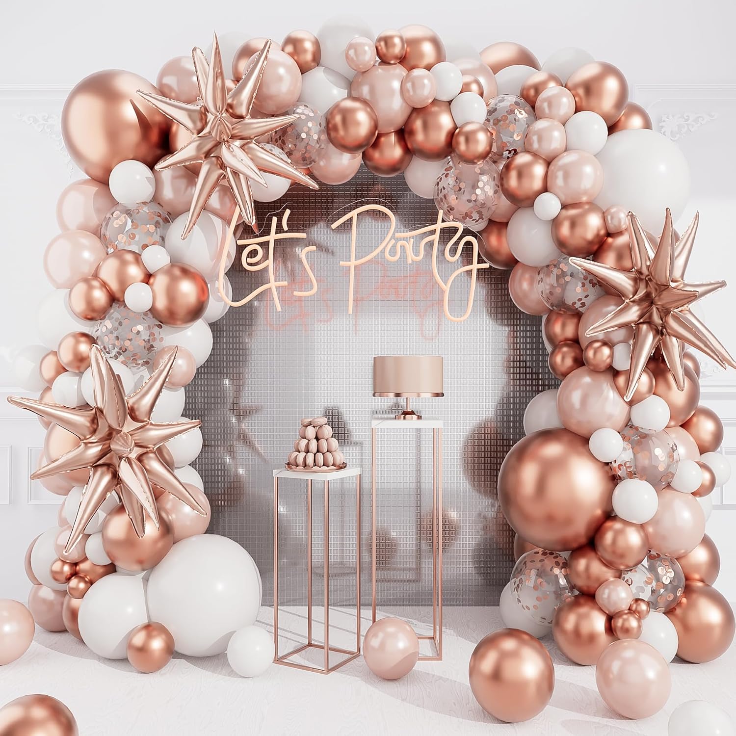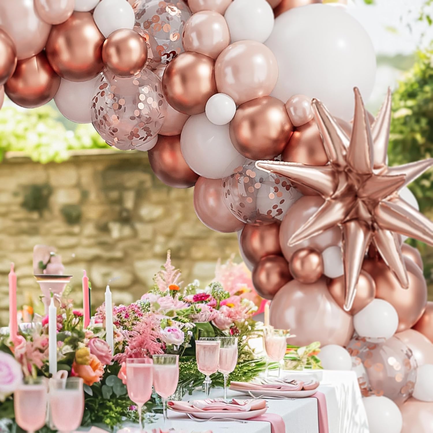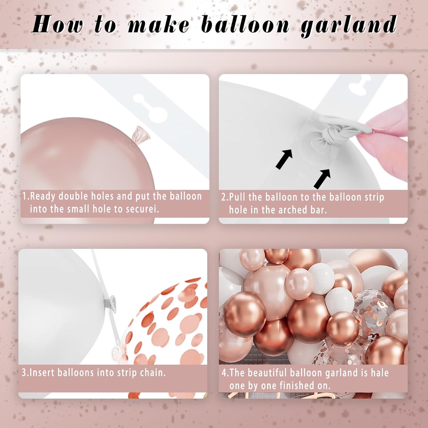 - ăPackage Includeă- The rose gold balloon arch kit includes rose gold starburst balloons 22â3pcs,metallic rose gold balloons(18â2pcs+12â5pcs+10â30pcs+5â20pcsïŒ,white balloonsïŒ18â2pcs+10â30pcs+5â10pcsïŒ,pearl rose gold balloonsïŒ10â20pcs+5â10pcsïŒ,rose gold confetti balloons 12â10pcs,balloon glue dotïŒballoon decorating strip.