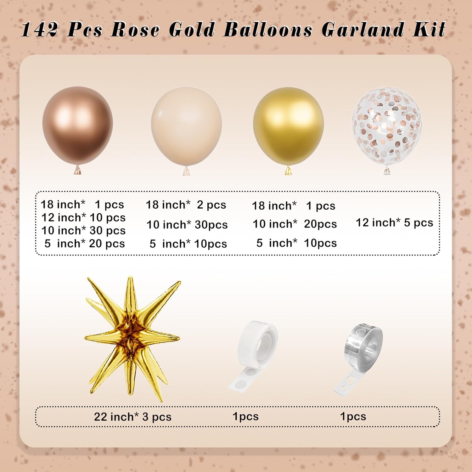 - 【Package Include】- The rose gold balloon arch kit includes gold starburst balloons 22”3pcs,metallic rose gold balloons(18”1pcs+12”10pcs+10”30pcs+5”20pcs),macaron orange balloons(18”2pcs+10”30pcs+5”10pcs),metallic glod balloons(18”1pcs+10”20pcs+5”10pcs),rose gold confetti balloons 12”5pcs,balloon glue dot;balloon decorating strip.