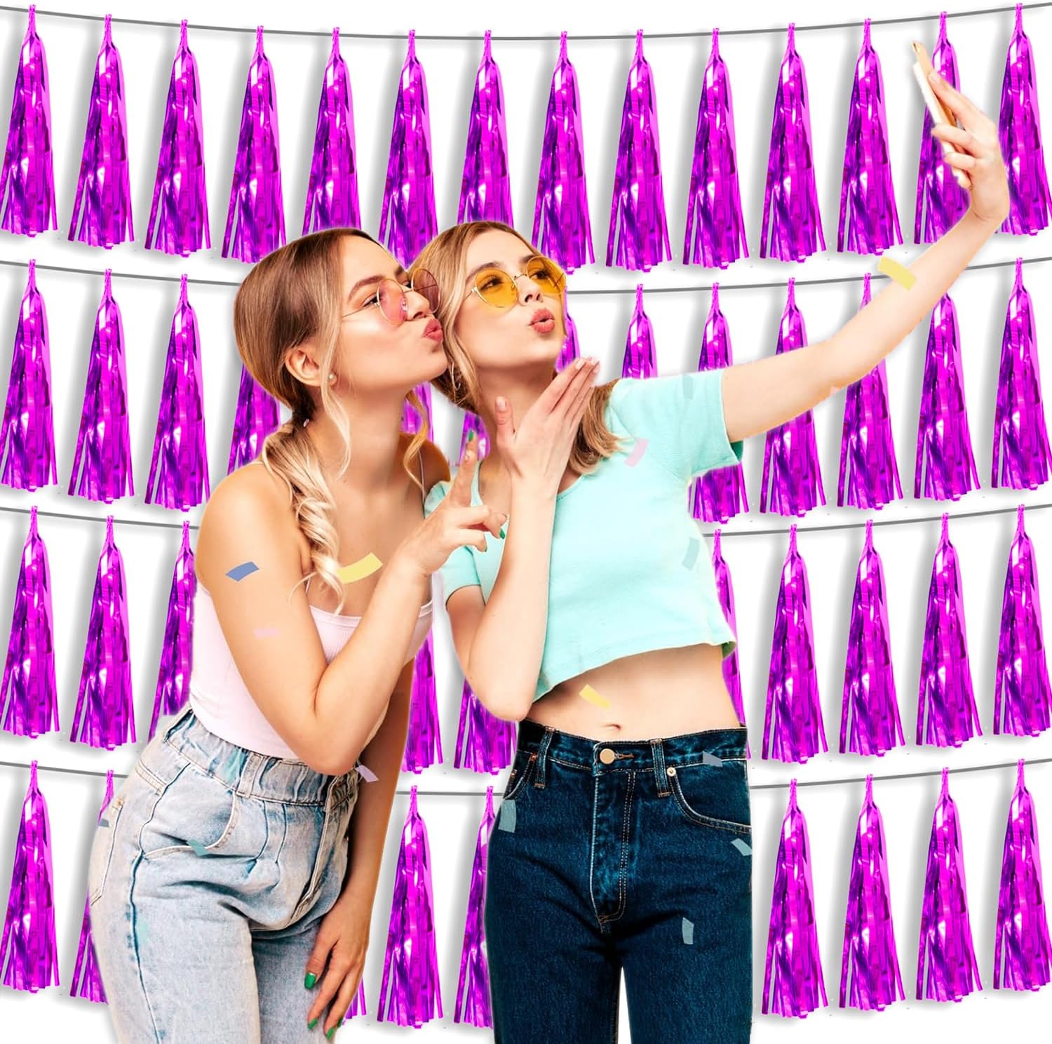 4P Hot Pink Foil Fringe Tassel Banner Garland Metallic Tinsel Streamers Wall Hanging Curtain Backdrop Banners for Parade Floats, 2024 Graduation Decorations, Wedding Party Decoration