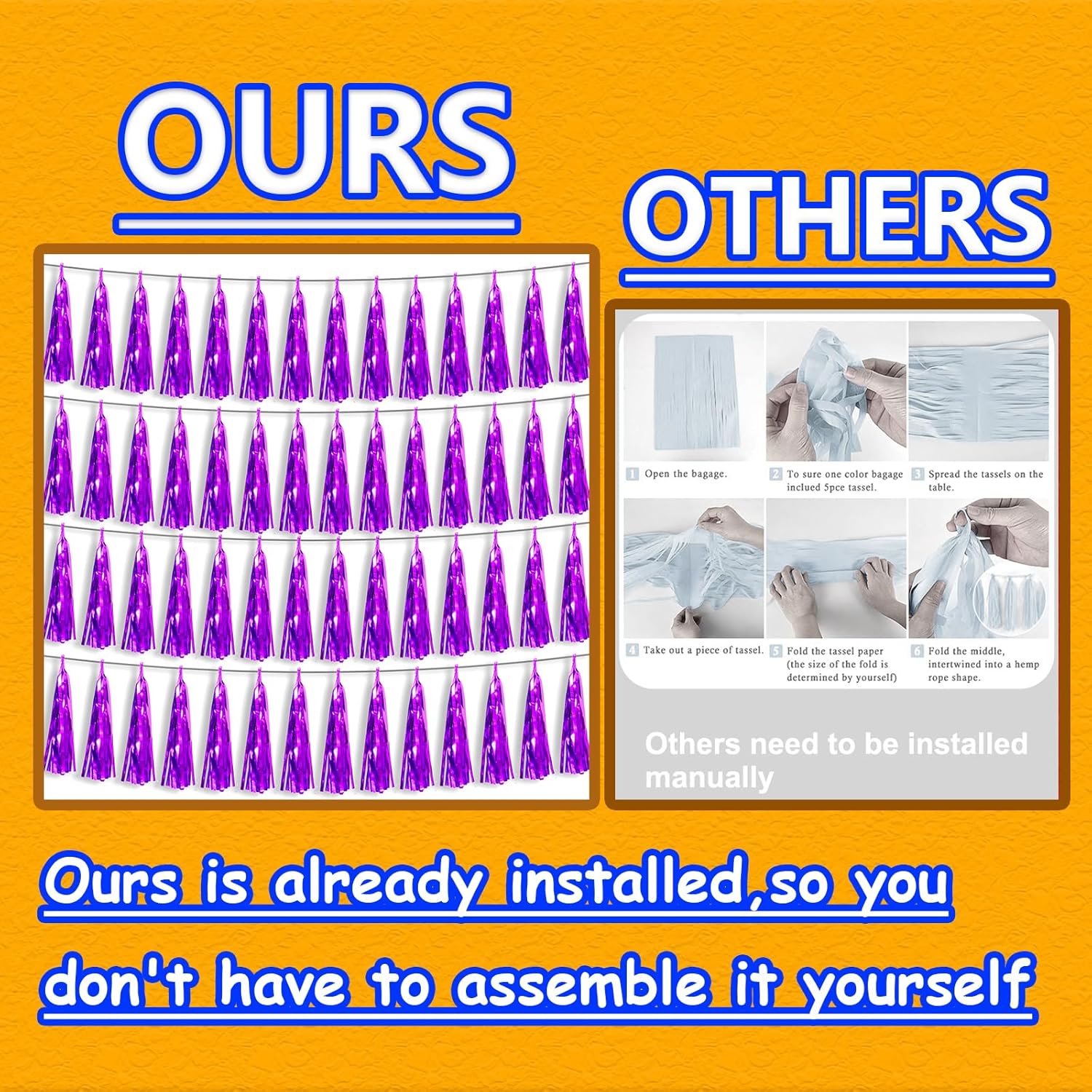 - 【Package Includes】The total length of the purple birthday tassels banner is 40 feet, divided into 4 strips, each 10 feet long. Each banner contains 15 tassels, and each tassel measures 14 inches, for birthday decorations many occasions uitable for Patriotic display, Homecoming Float, Christmas Float, ecorative metal trailers, graduation floats etc