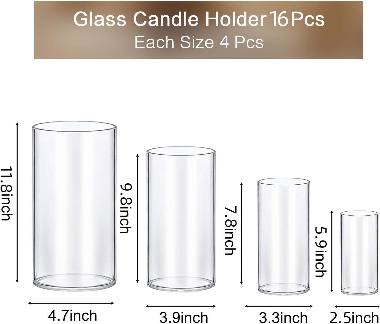- 4 Different Sizes Candle Holder: The set glass candle holder includes 4 different size—Large Size: width 4.7'' x height 10'', Medium Size: width 3.9'' x height 7.8'', Small Size: width 3.3'' x height 5.9'', each size 4 pcs, It can be used as a pillar candle holder, floating candle holder, and vase for flowers, which is the ideal choice for modern home decoration
