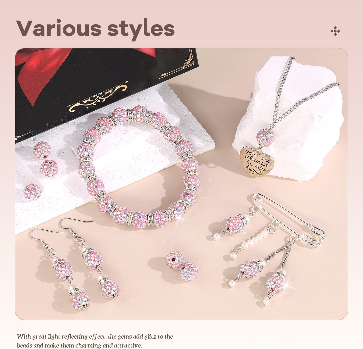 - BLING EFFECT --With great light reflecting effect, the gems add glitz to the beads and make it charming and eye-catching. Our beads are made of polymer clay embedded with glass rhinestones with shining and it's not easy to fall off