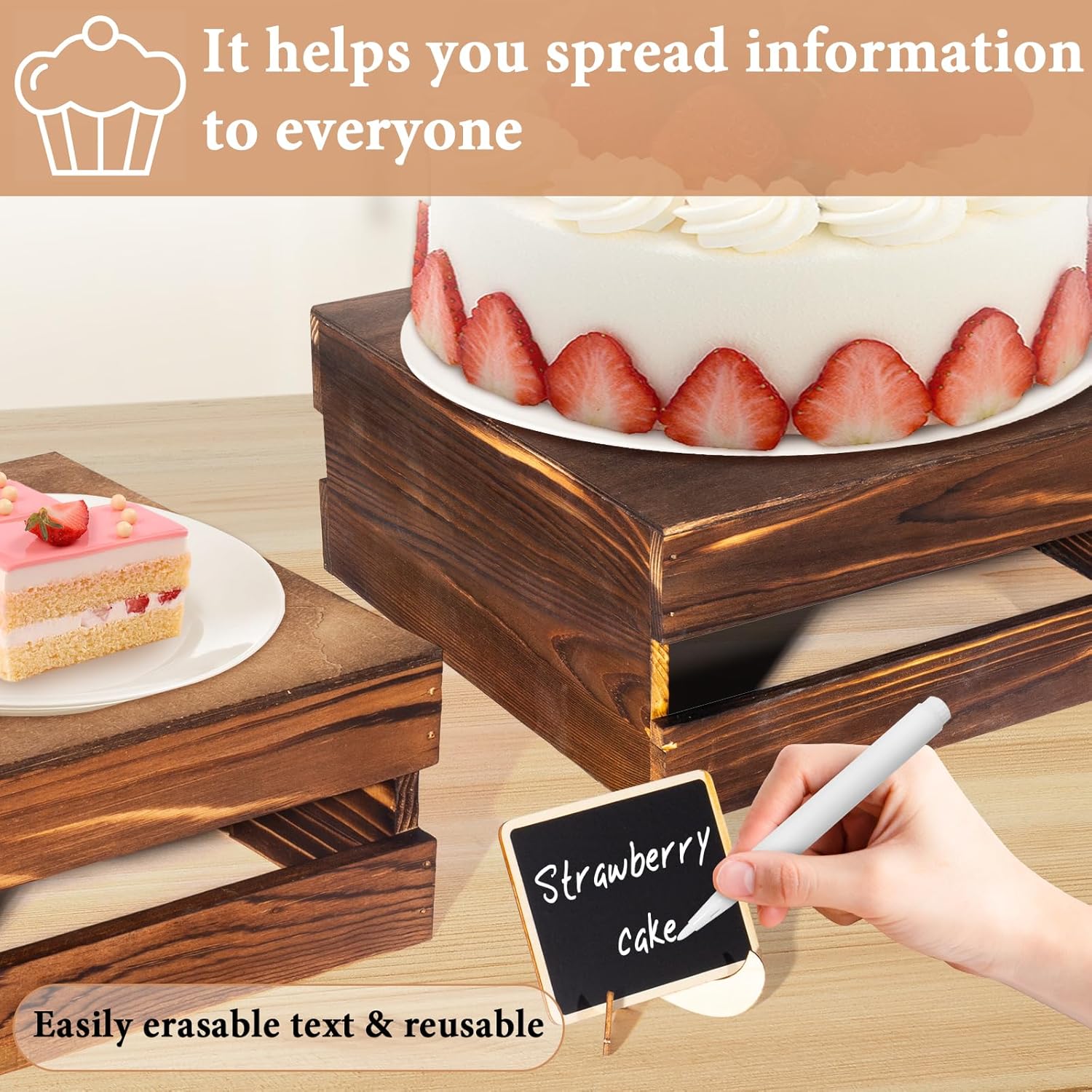 - Your Party's Sweet Companion: You will receive a set of 8 wooden cake stand risers (available in 4 sizes), 8 wooden signs and 2 pens, enough quantity and different sizes to meet the needs of different sizes of cakes, snacks and desserts for display. The wooden signs can be used to write down hints for ease of use while adding elegance to your dessert table.These wooden stackable display boxes will not take much displaying space