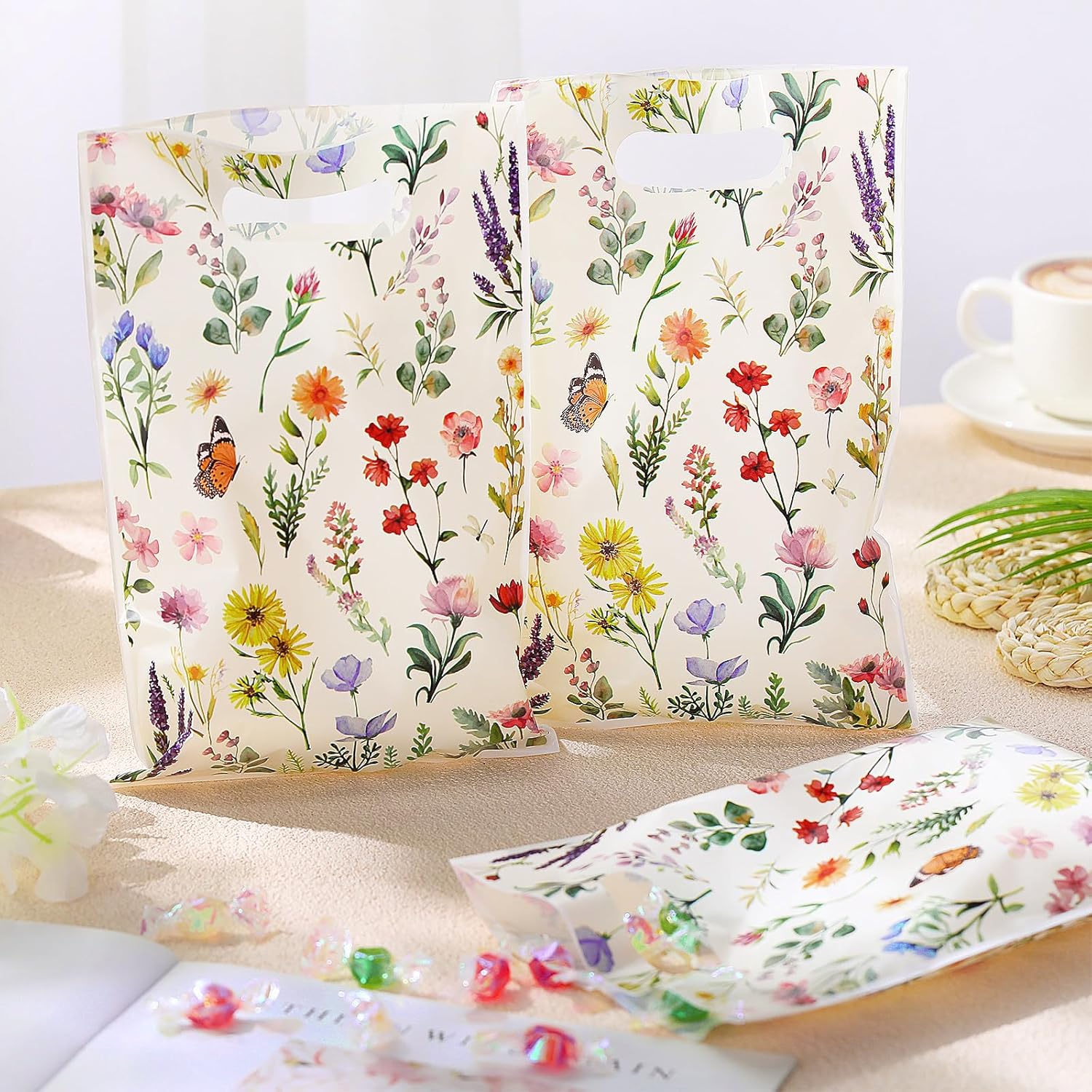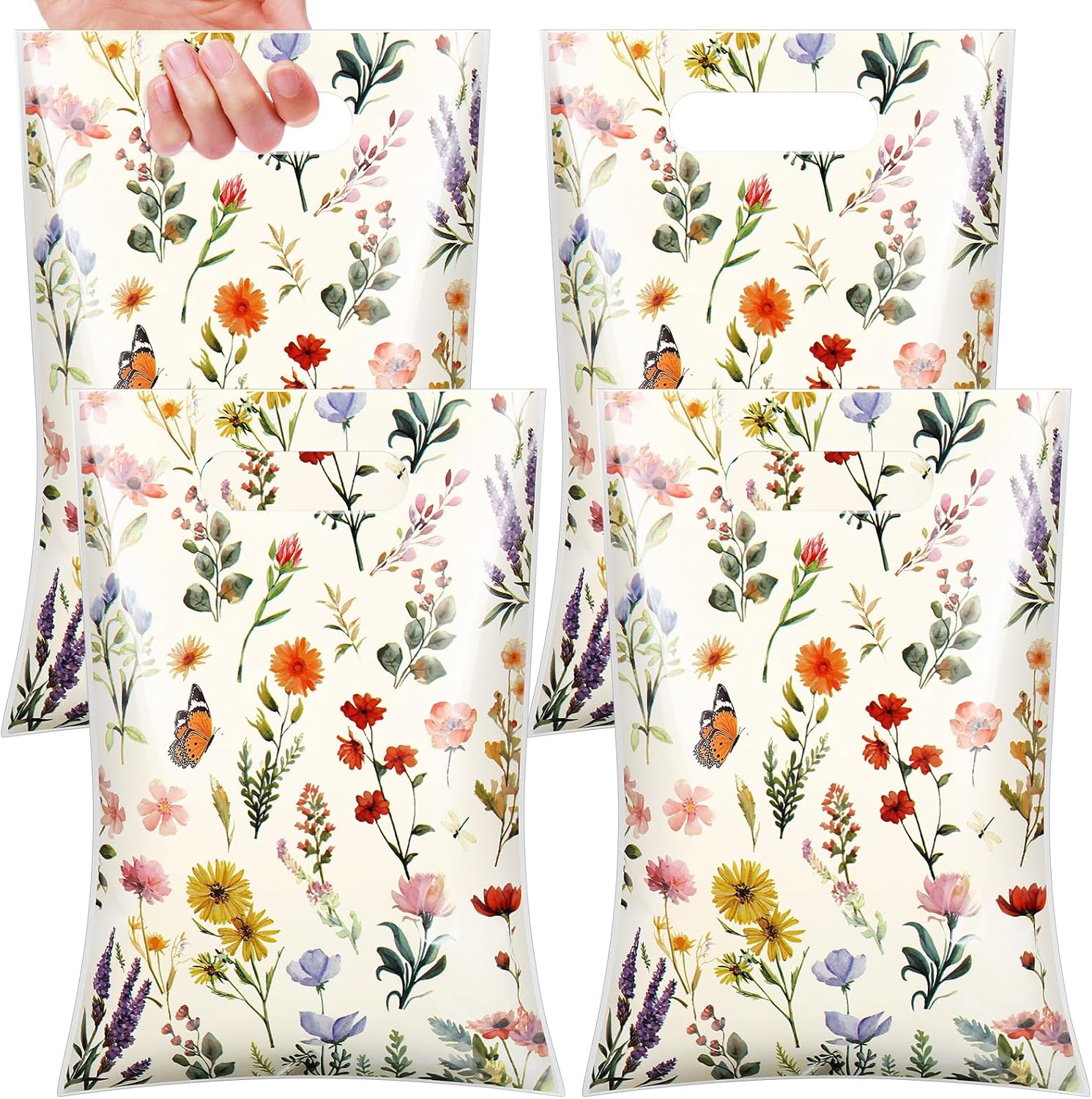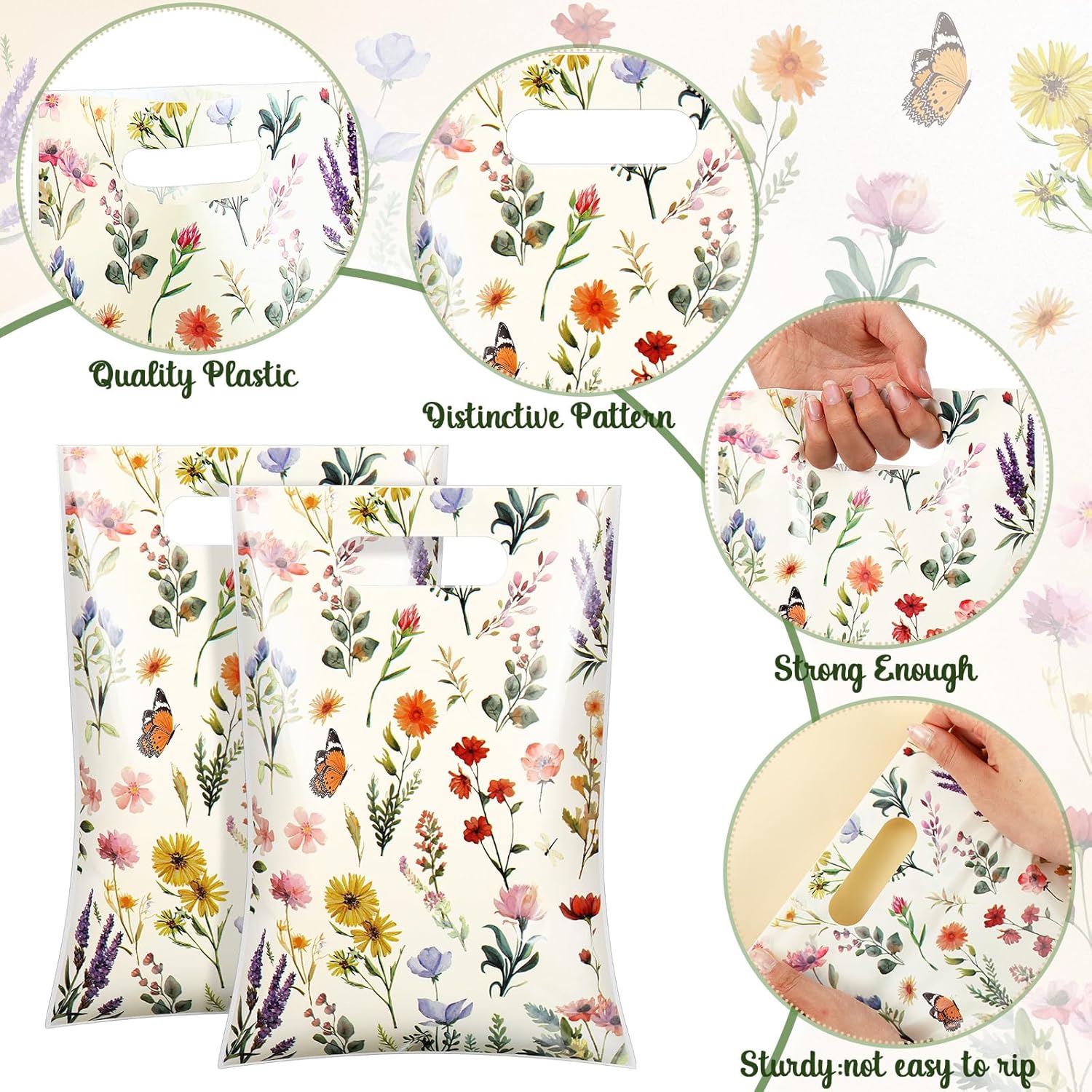 100 Pcs Wildfloral Gift Bags Vintage Wildflower Party Favor Bag with Handle Wildfloral Plastic Goodie Candy Treat Gift Wrapping for Summer Baby Shower Birthday Wedding Party Supplies (White)