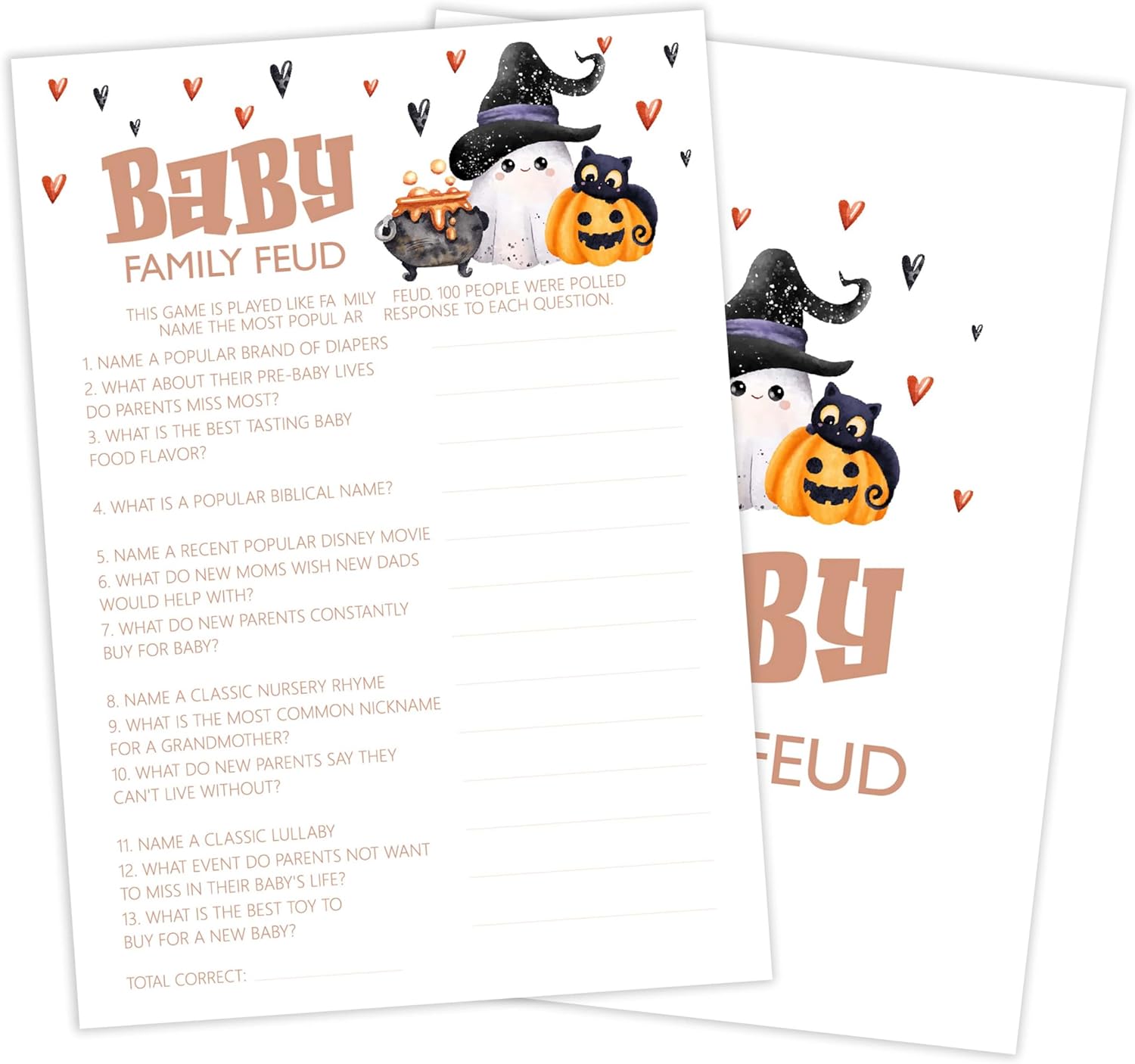 Baby Shower Games, Halloween Baby Family Feud, 25 Double-Sided Game Cards + 1 Answer Card for Gender Reveal Party Decorations Supplies Announcement - B06