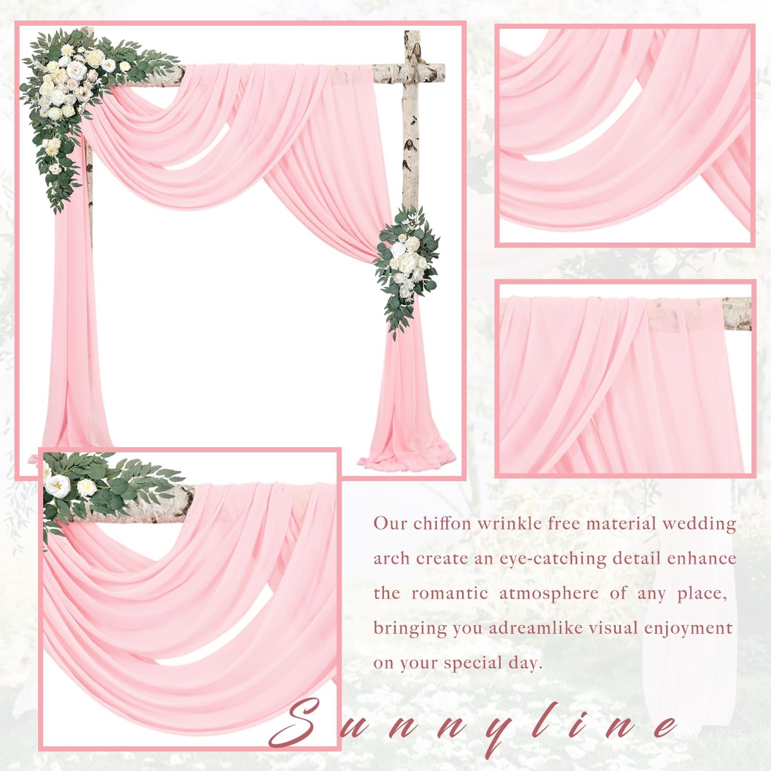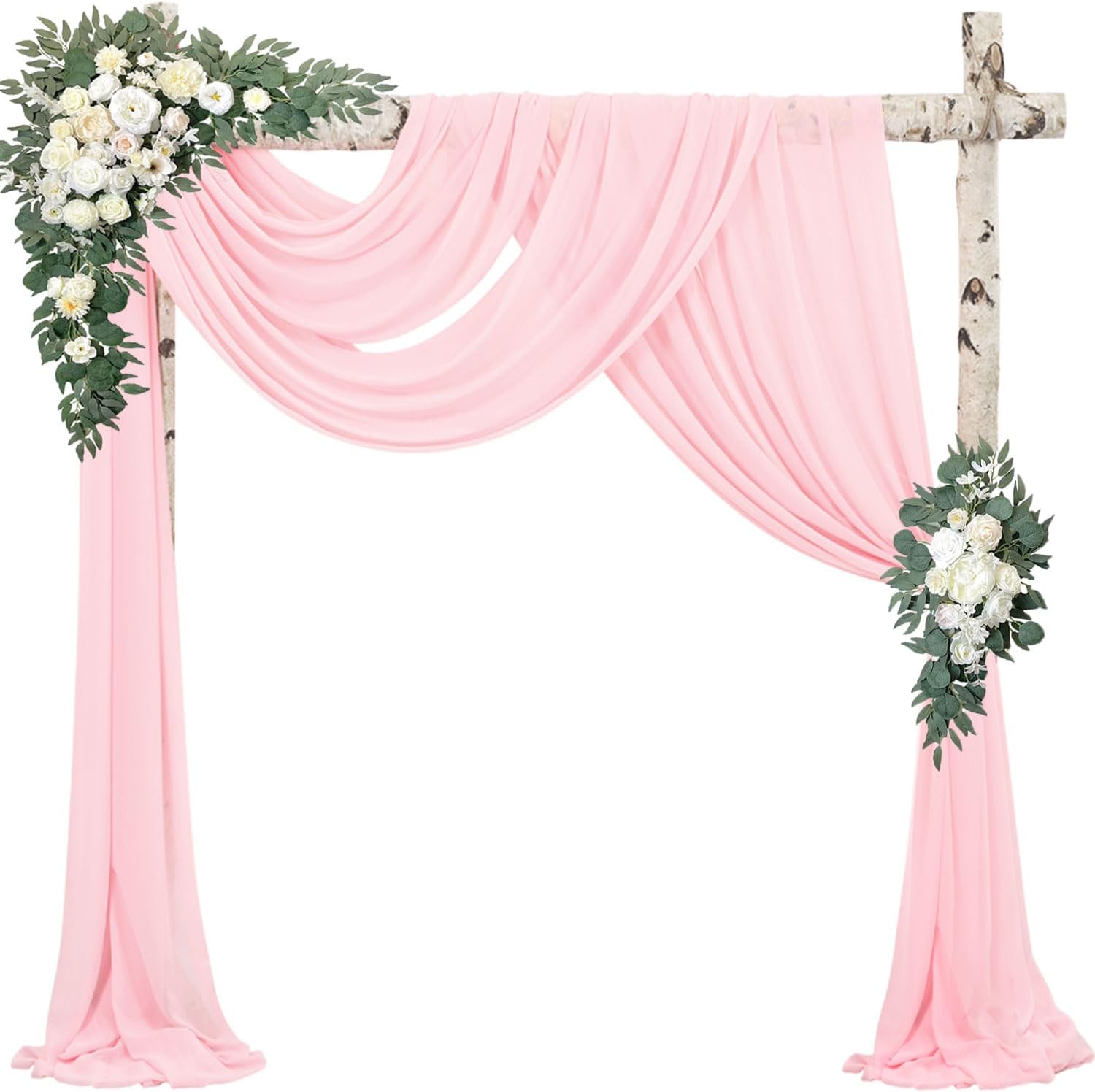 - Wedding Arch Draping Fabric Material: The wedding arch draping fabric is high-quality chiffon fabric, it is very smooth to the touch, soft and does not wrinkle. They create an eye-catching detail that brings long-lasting visual enjoyment, they are perfect for wedding decorations and ceremonies.