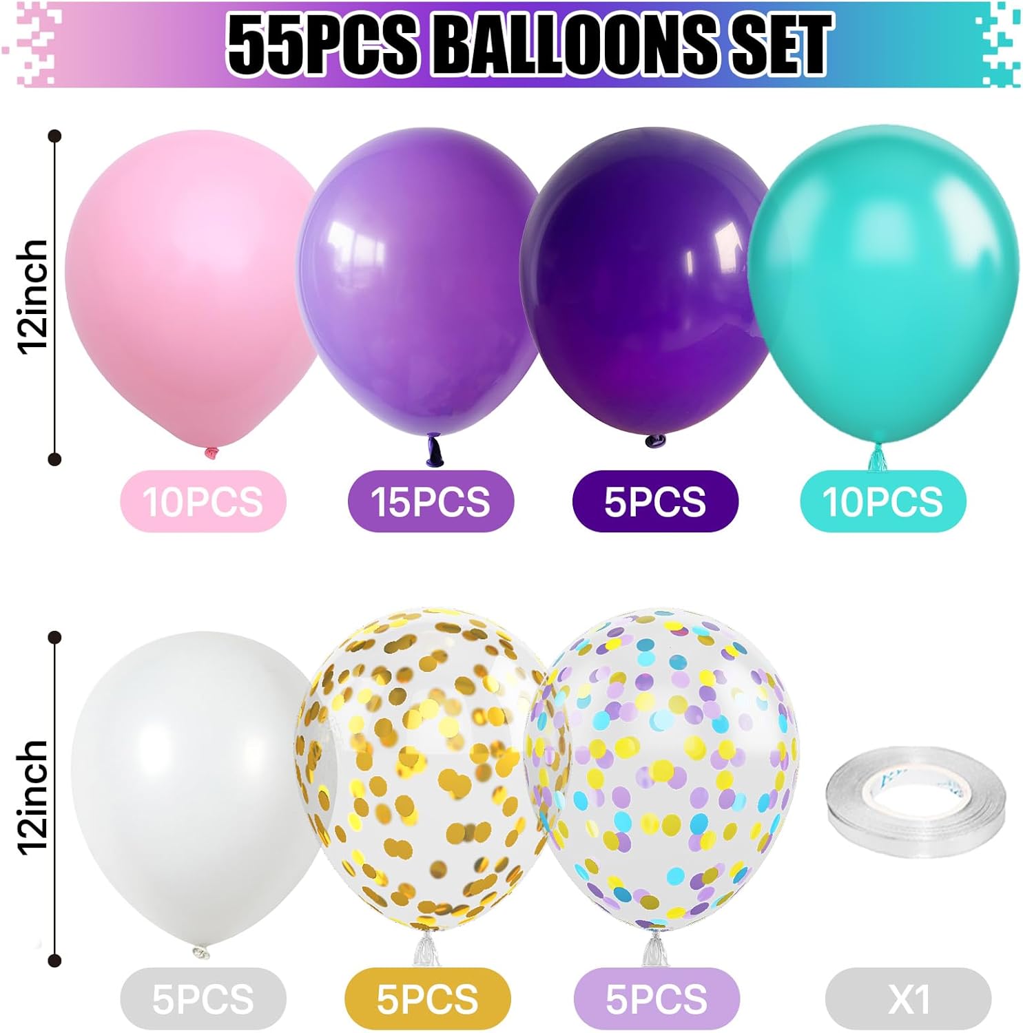 - ๐12INCH BLUE PINK PURPLE BALLOONS: The package includes 55 pcs 12 inch balloons: 5 pcs gold confetti balloons, 5 pcs teal purple gold confetti balloons, 5 pcs dark purple balloons, 15 pcs purple balloons, 10pcs pink balloons, 5 pcs white balloons, 10pcs teal balloons and 1pc 10m ribbon. Enough quantity and different colors for satisfying your various decoration needs!