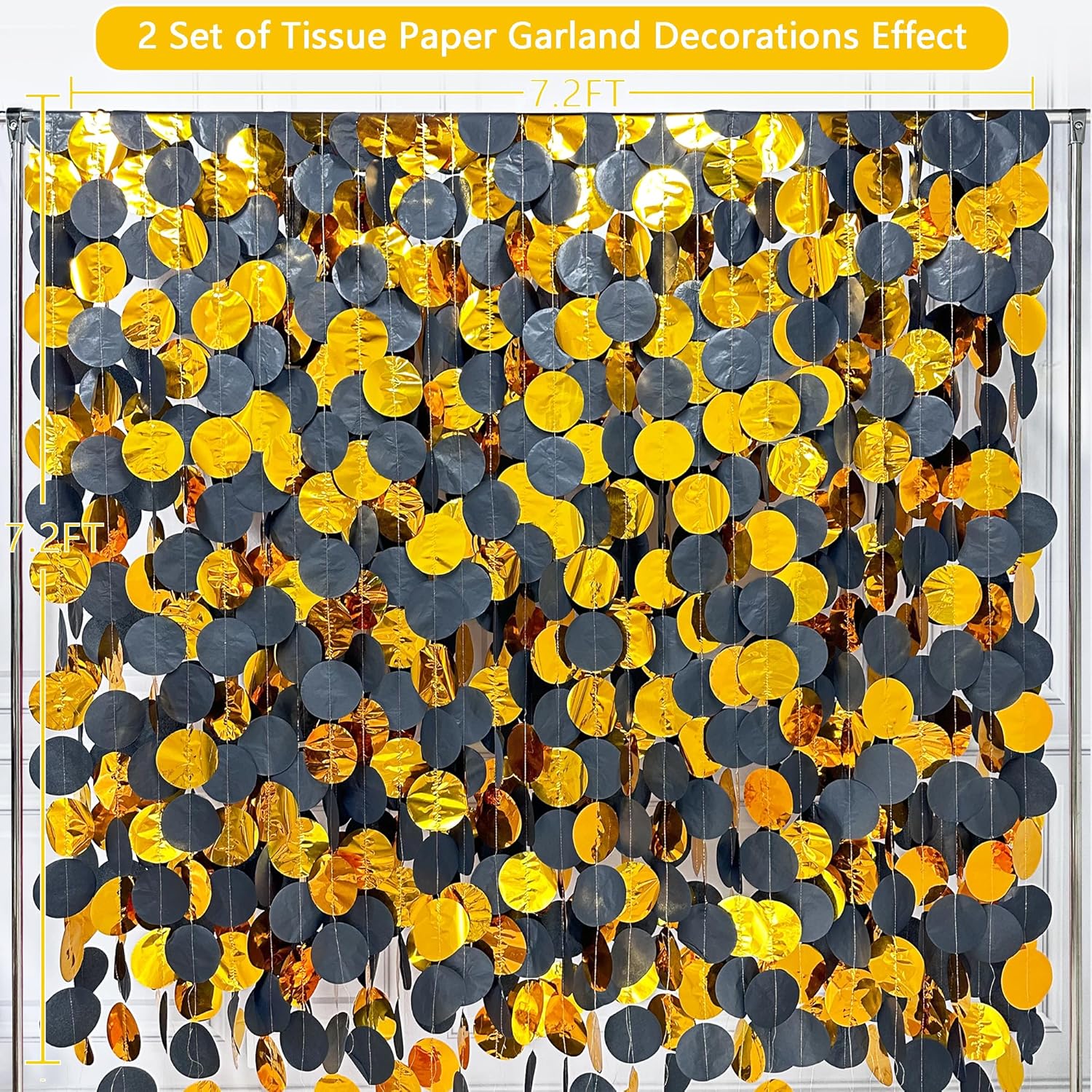 - Environmental Material-Our black gold big circle dot streamer garland are made of quality black tissue paper and gold metallic foil paper,carefully hand-made and machine-sewn together with thread.durable and reusable.Unroll & unwrap the backdrop garland carefully. Due to delicate nature of thread, may tangle.
