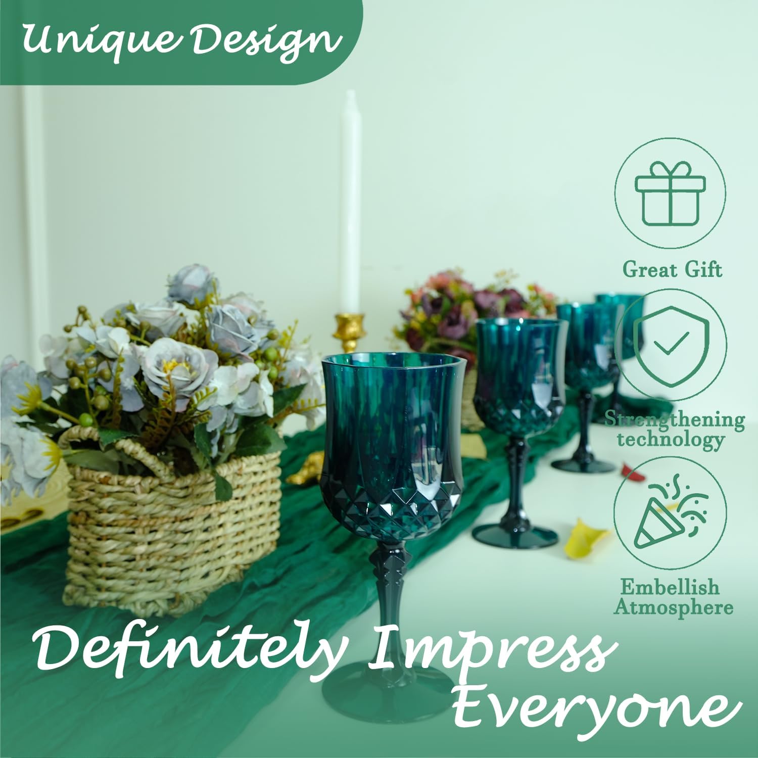 - 🍷🍷🍷【Product Description】 This set includes 12 retro-style dark green party plastic wine glasses, providing ample quantity to meet your daily use and replacement needs. The elegant and sophisticated design makes your wedding reception unique