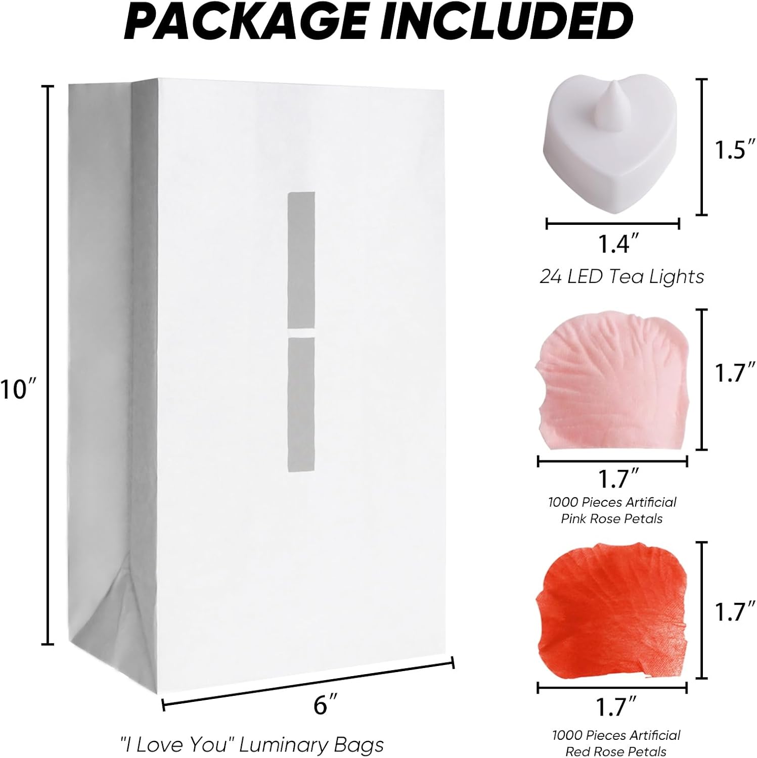 - Impressive Romantic Kit: You will get I Love You letter light up sign; 24 Pcs LED tea lights; 1000 Pcs red fake rose petals and 1000 Pcs pink fake rose petals. Creating a warm atmosphere for this important day