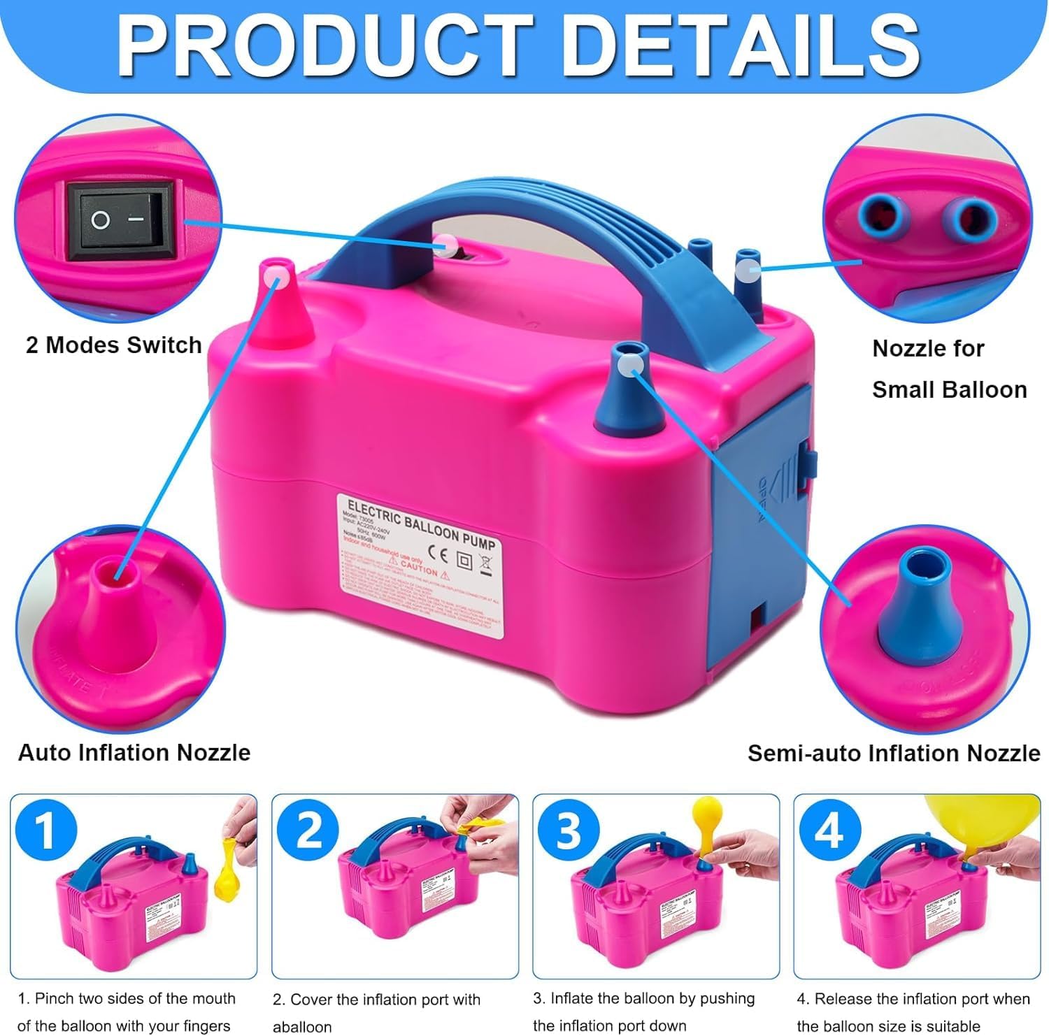 - ăSafety & Portable Balloon Pumpă- ETL Approved, The Pump Has Overheating Protection Function, Totally Safe To Use. It Has Manual And Automatic Pumping Modes, Which Will Inflate A Balloon In Only 2 Seconds, Hundreds Of Balloons Will Be Pumped In Minutes. The Easy-Grip Handle And Portable Size Allow You To Take It Anywhere For On-Site Balloon Filling.