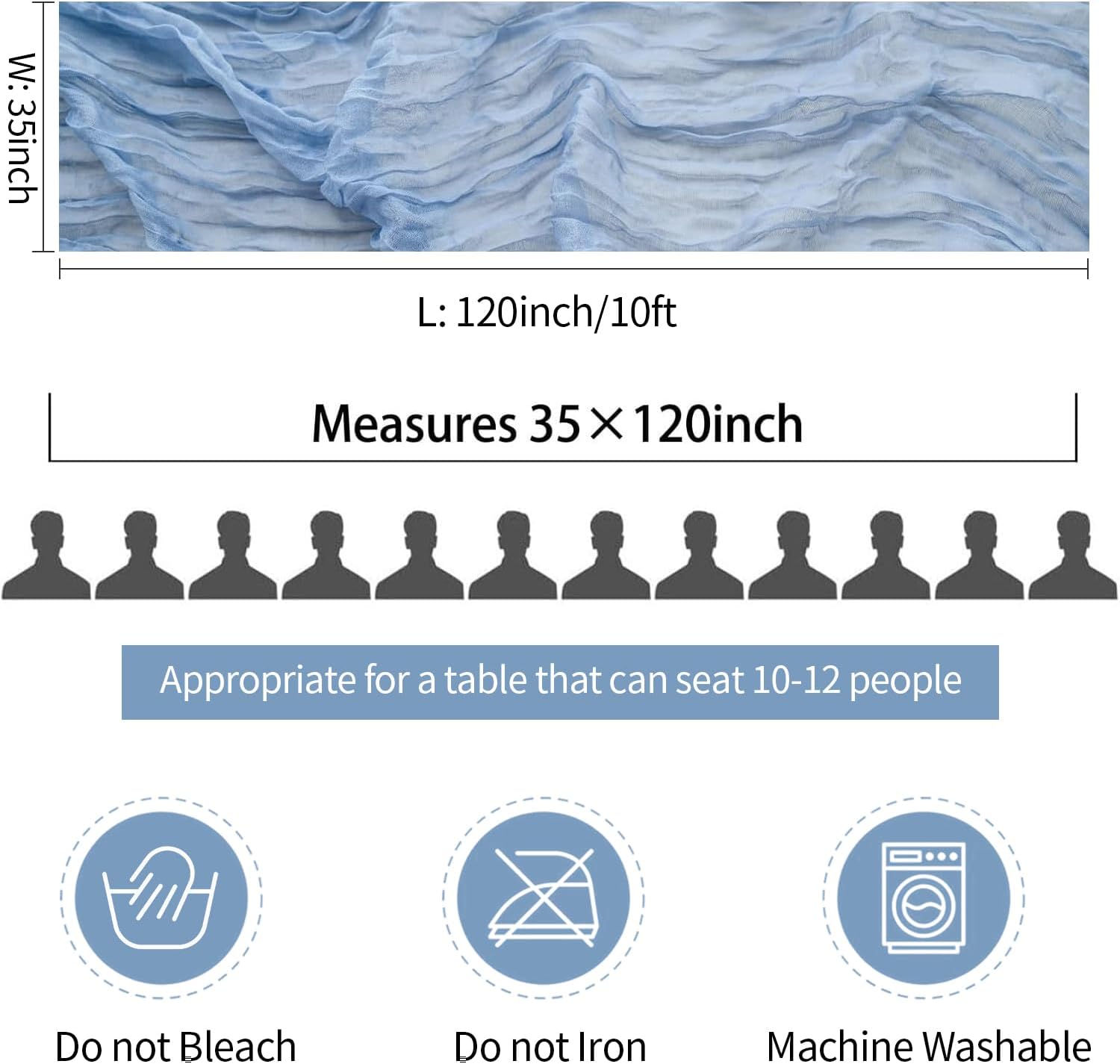 - 🍸【Care Instructions】These pretty wedding table runners are recommended for hand wash in cold water with mild detergent, or machine wash in the gentle cycle with a laundry bag; In order to maintain wrinkled texture, please do not iron or use hot water, lay flat or hang dry, which are better for keeping these cheesecloth table runners for a long time use. Please kindly noted that there might be color variation due to screen resolution and limitations in photography.