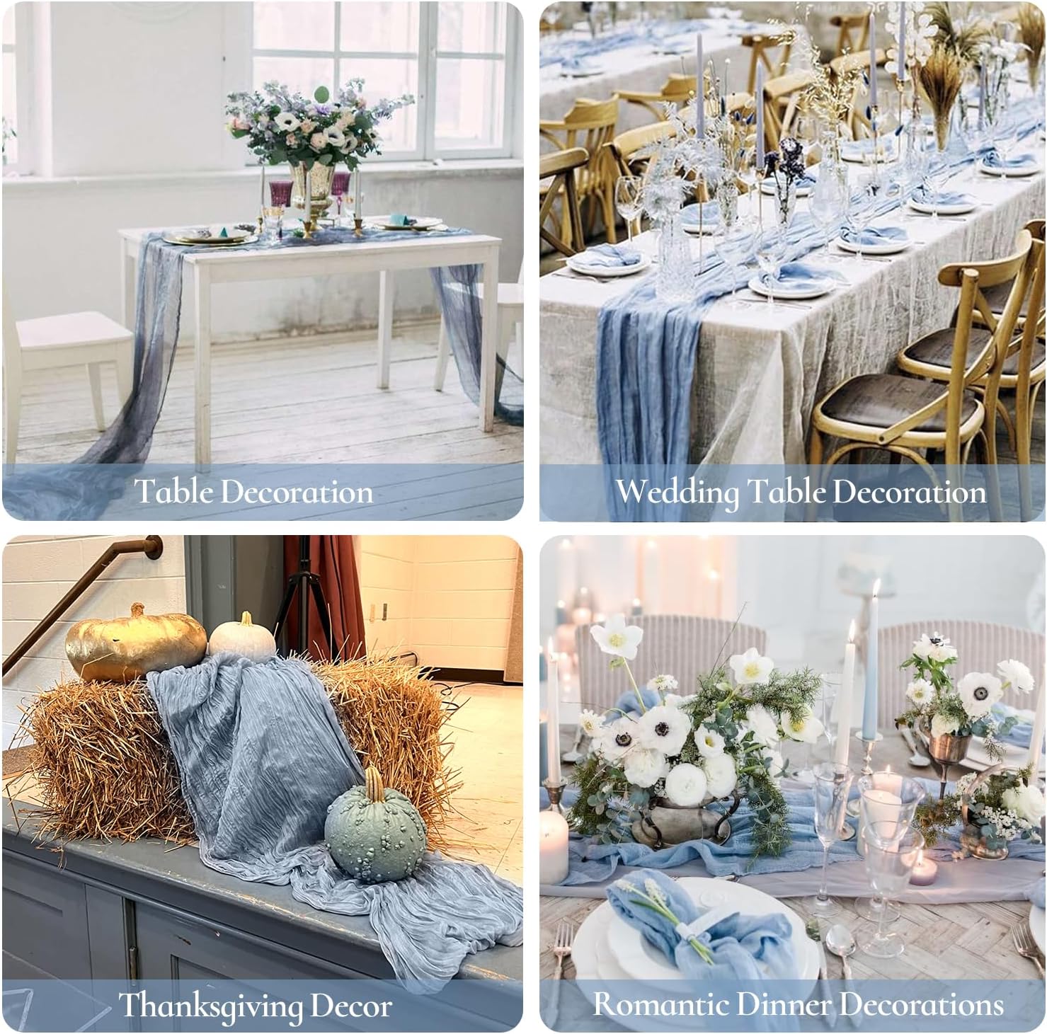 - 🍸【Long Dusty Blue Centerpieces for Table】The size of each gentle blue table runner cheesecloth is approximately 35 x 120 inches / 90 x 300 cm, which is large enough to cover rectangle and round tables, can also be spliced together for long tables. A simple and easy way to dress up a table as wrinkled design no ironing is required & they add a soft touch to your decor! The fluffy gauze table runner can be compressed, lightweight, and compact, easy to store, more space-saving.