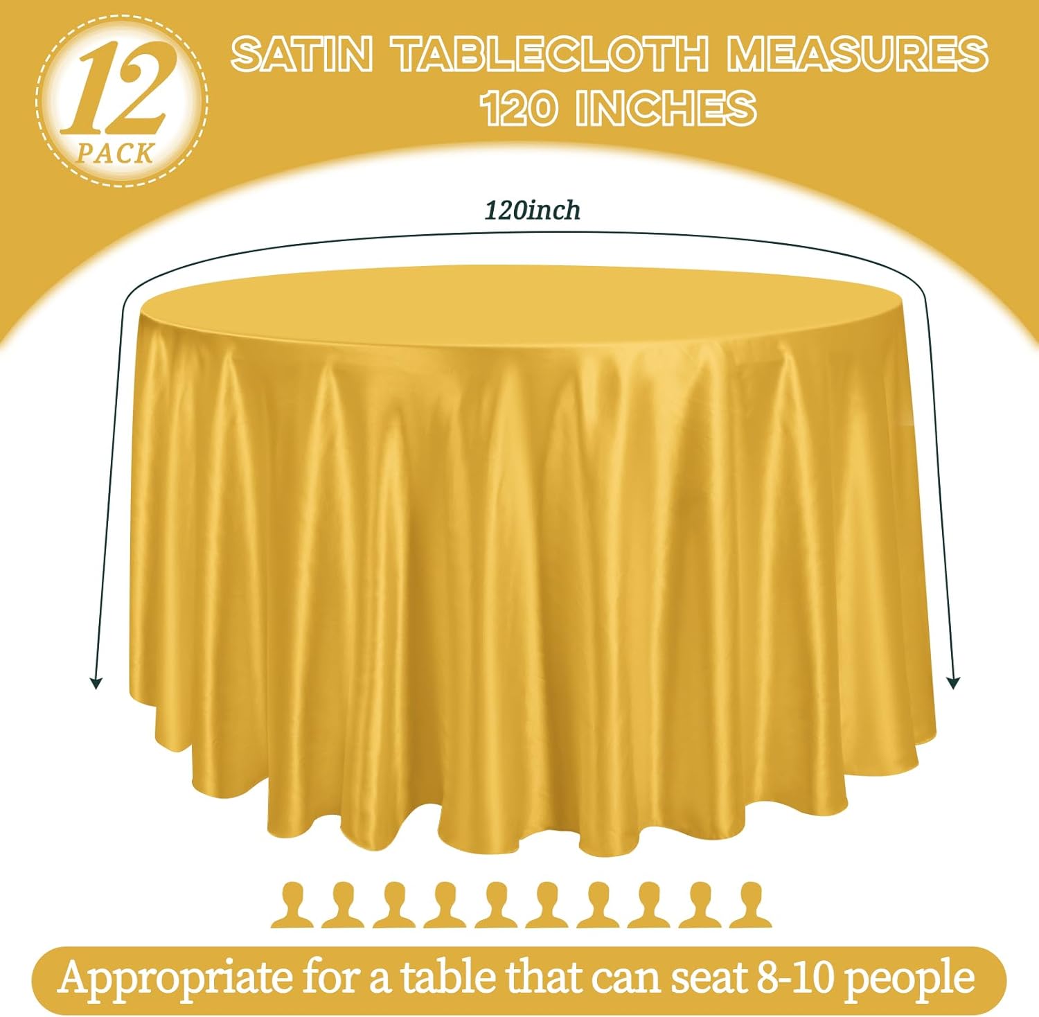 - 【Round Satin Tablecloths】12 Pieces premium gold satin round tablecloth. The size of silk satin table cover is 120 inches, large enough to decorate a table that can accommodate 8-10 persons. It is suitable for most household round tables and can meet your different needs. Sufficient quantities are sufficient for party events to enhance the charm of your event decoration. The tablecloth size is usually larger than your table size. Please measure your table size before buying.