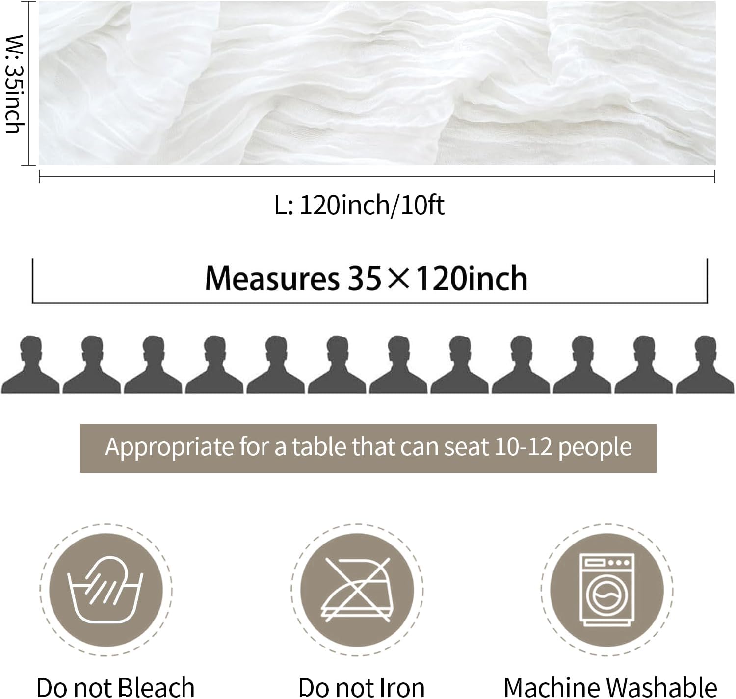 - đ„ăPACKAGE INCLUDEDăYou will receive 12 pieces of white cheesecloth table runners. Elegant and beautiful design, exquisite workmanship. ivory table runners size: Each boho table runner is 35 x 120 inches. Enough to cover rectangles and round tables, as well as long tables that are stitched together. Cheesecloth table runner white 12 pack can even be used to belt chairs decorate napkins, background curtains, or even gift wrap. Round or square tables for 8-10 people, perfect for romantic and elegant party events.