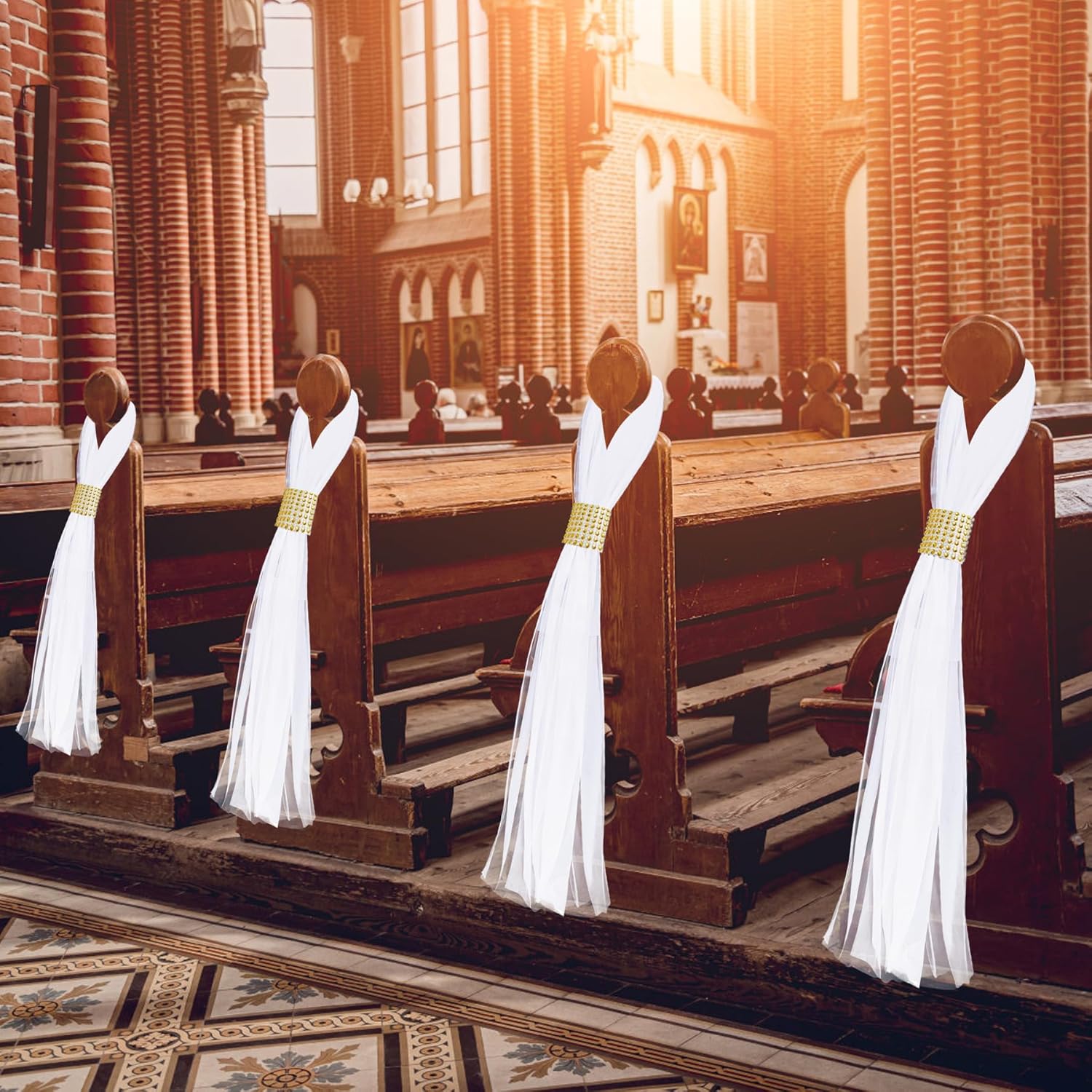 - Wedding White Pew Bows Tulle Set: 26 pieces church pew wedding bows tulle decorations; Each set wedding decorations for ceremony is assembled,tulle is decorated with a gold shiny rhinestone wrap;adequate quantity and exquisite style to meet your wedding decor chair decoration needs