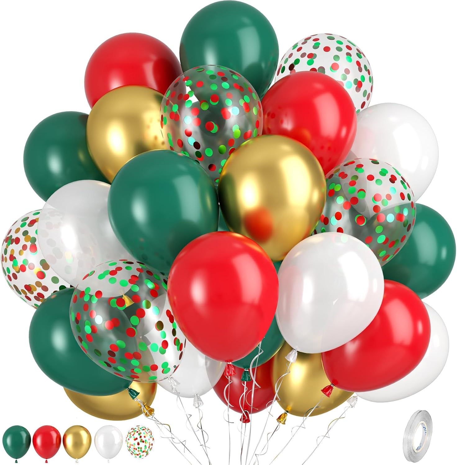 - 12 inch Red Green White Balloons Set: 12pcs dark green balloons, 7pcs metallic gold balloons, 12pcs matte red balloons, 12pcs pearl white balloons, 7pcs red and gold confetti balloons, 1pcs silver ribbon in our party balloons set. Our Christmas balloons add that perfect touch of holiday magic. Suitable for decorating a Christmas party and will bring so much joyful atmosphere.