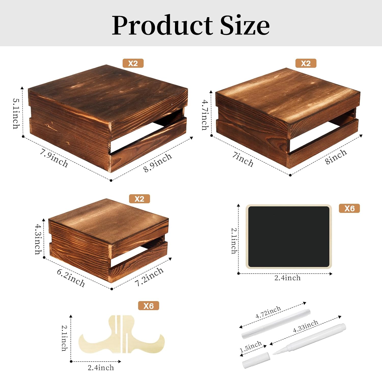 - Your Party's Sweet Companion: You will receive a set of 6 wooden cake stand risers (available in 3 sizes), 6 wooden signs and 2 pens, enough quantity and different sizes to meet the needs of different sizes of cakes, snacks and desserts for display. The wooden signs can be used to write down hints for ease of use while adding elegance to your dessert table.These wooden stackable display boxes will not take much displaying space