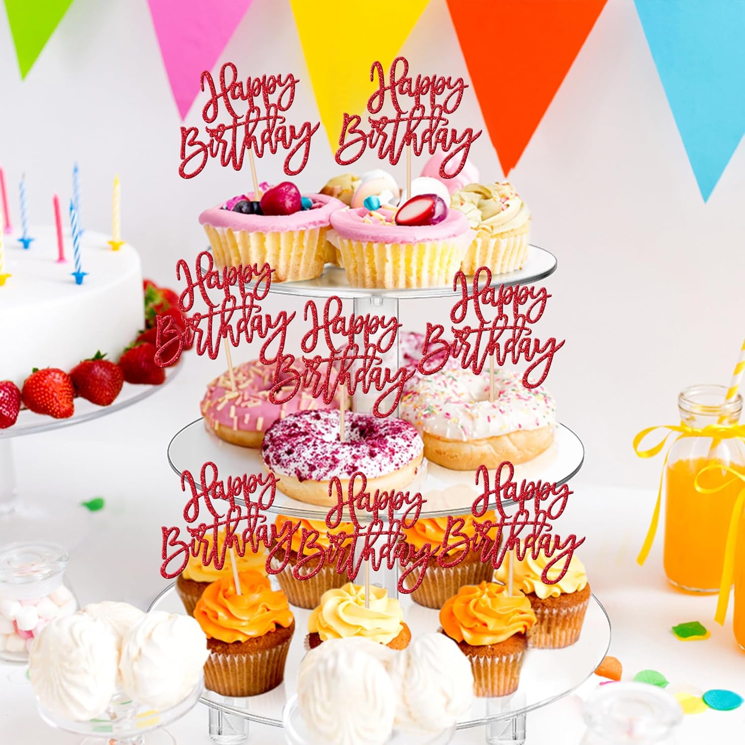 24 PCS Glitter Cupcake Toppers - Happy Birthday & Anniversary Picks - Red