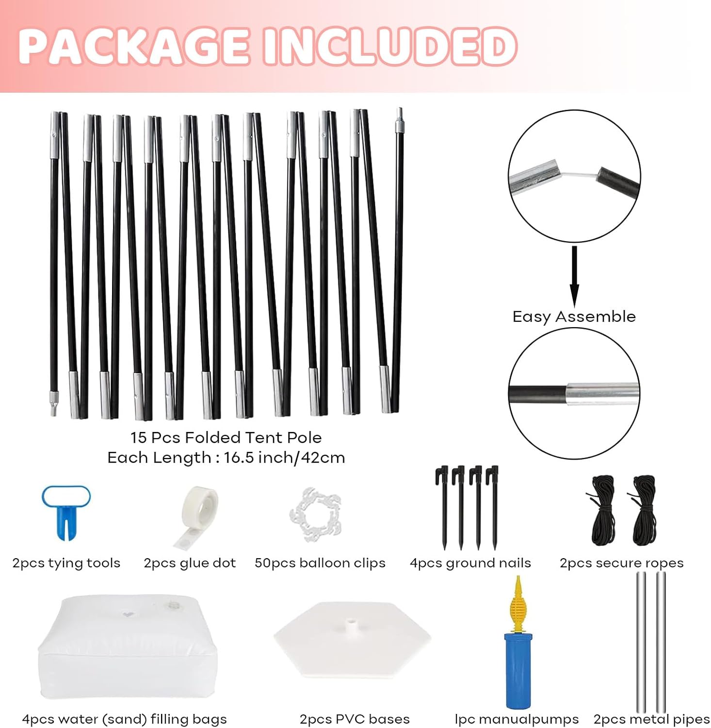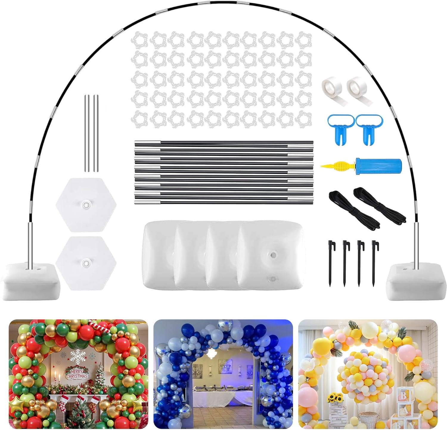 - Balloon Arch Stand Kit Includes: The balloon arch kit package includes 2 x pvc Hexagonal bases, 4 x Water (sand) fillable bag, 15 x folded carbon fiber balloon poles (each 42cm), 2 x 30cm fixed poles, 50 x Balloon clips, 2 x 3-meter fixing ropes, 4 x ground nails, 2 x 1 balloon tape (200 dispensing Points), 2 x balloon knotter, 1 x manual balloon pump. The complete set allows you to make balloon arch decorations in one stop.