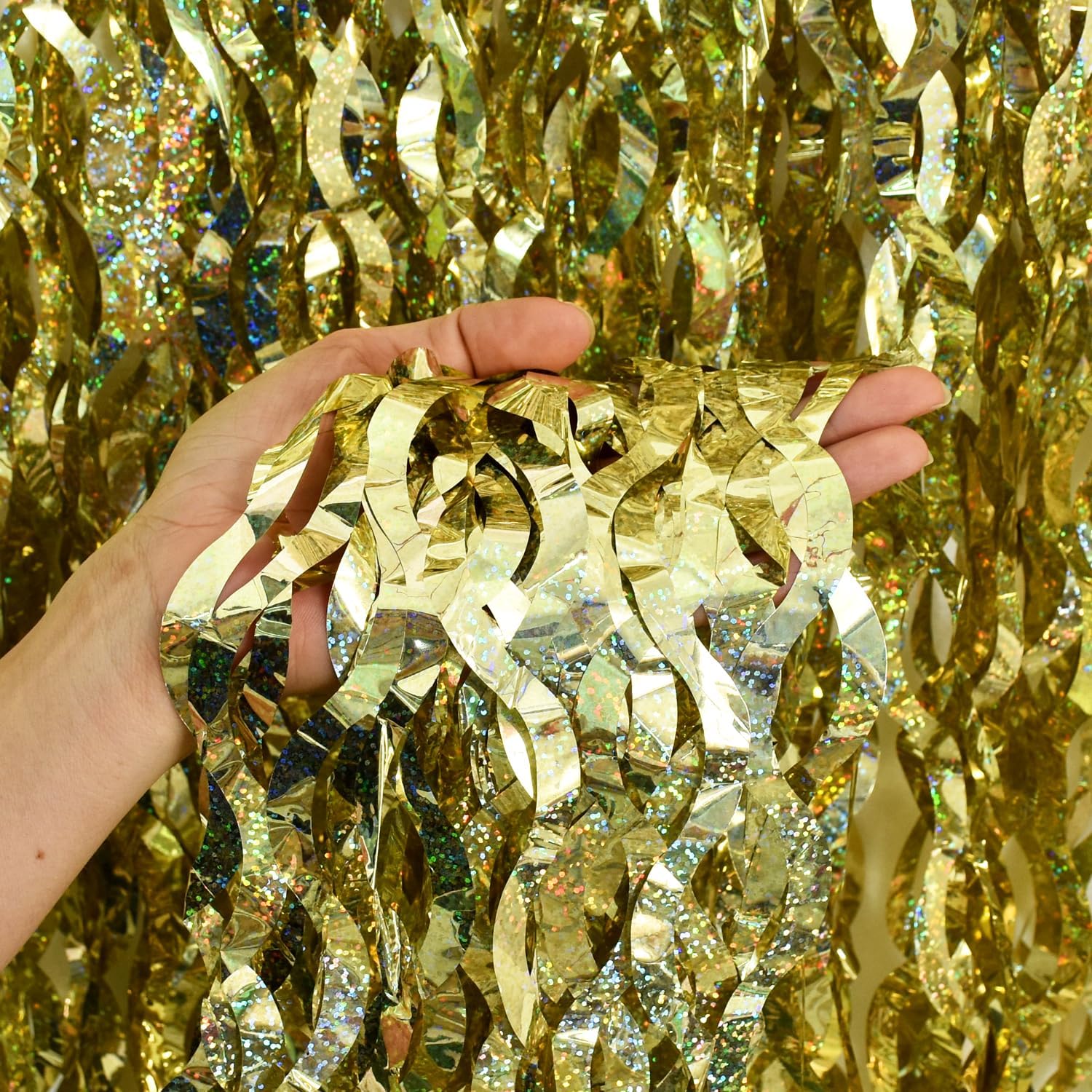 - TINSEL MATERIAL: The wavy foil curtain backdrop is made of tinsel with shiny surface,lightweight and resistant metallic fringe curtains.