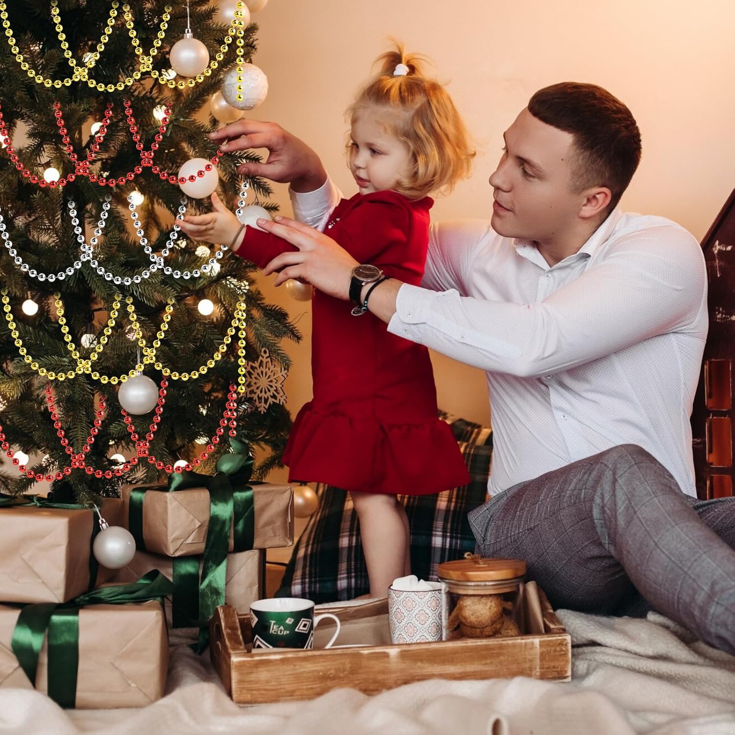 - Faux Pearl Beads Garland: Faux pearl rolls can be cut to the desired length. You can easily adjust the pearl strand length and cut to any length you need for your ornaments or DIY crafts. Each pearl is melted on a sturdy nylon cord, so it won't scatter, and it's easy to handle