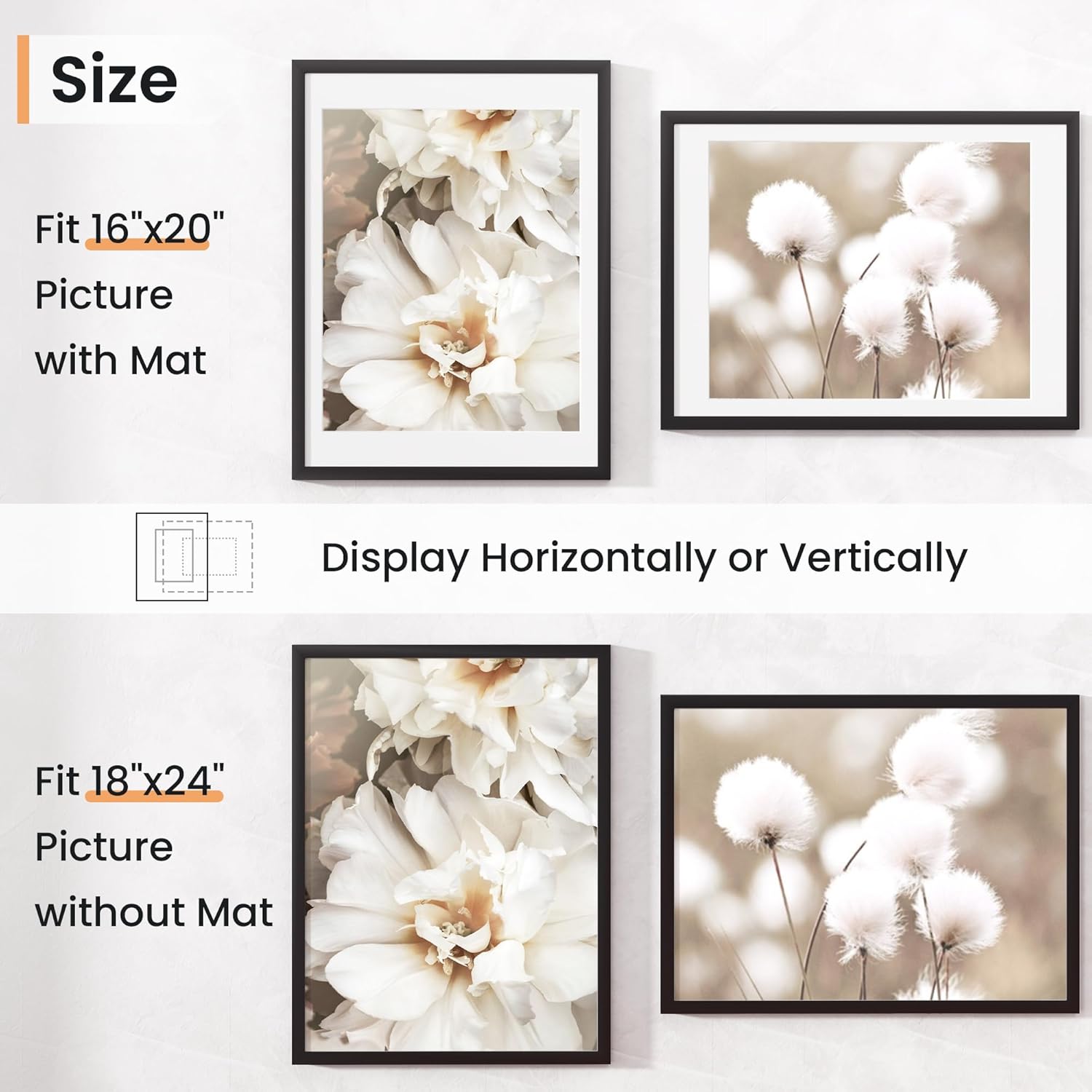 - Vertical & Horizontal Display - Our wall photo frames are versatile and easy to clip and hang. You can mount this plastic picture frame horizontally or vertically, with hanging hardware included. This picture frame maximizes your available space.